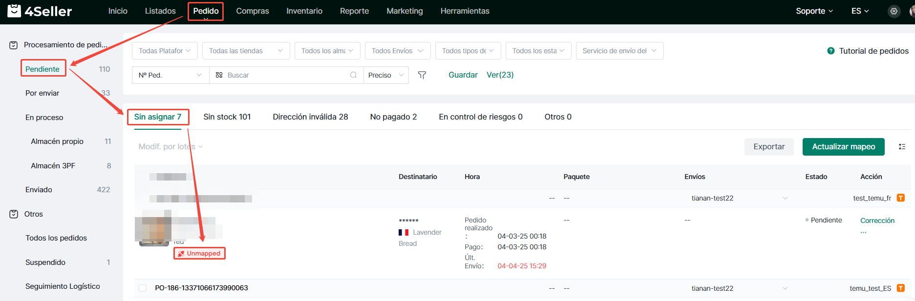 Resuelve problemas de SKUs no mapeados haciendo clic en Unmapped y vinculando los productos correspondientes.