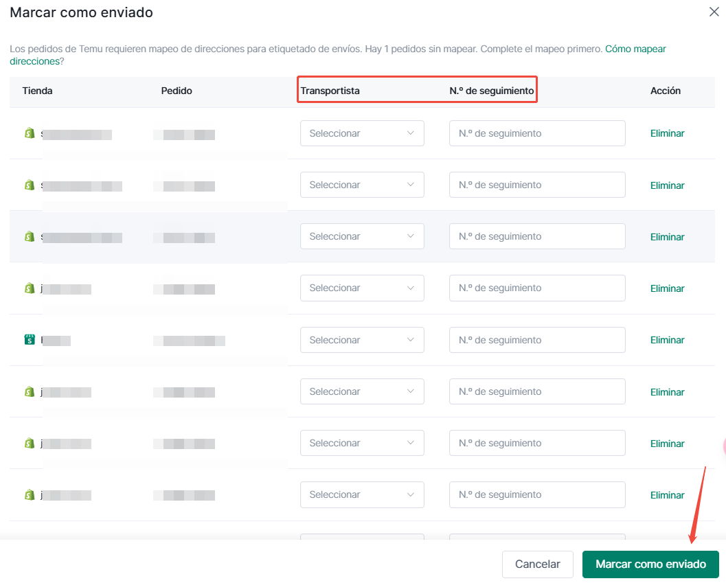 4Seller permite usar Marcar como Enviado para actualizar manualmente el Transportista y Número de Seguimiento en pedidos, soportando operaciones individuales o por lotes: