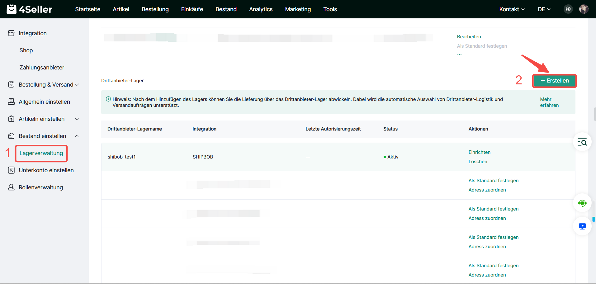 Gehe zu den Lagerverwaltung und klicke im Bereich Drittanbieter-Lager auf Erstellen, um dein FBA‑Lager hinzuzufügen. Nachdem du auf Confirm getippt hast, wird dein Amazon‑FBA‑Lager für 4Seller autorisiert. Dadurch erhält die 4Seller Zugriff auf deinen FBA‑Bestand und kann Multi‑Channel‑Bestellungen automatisch erfüllen.