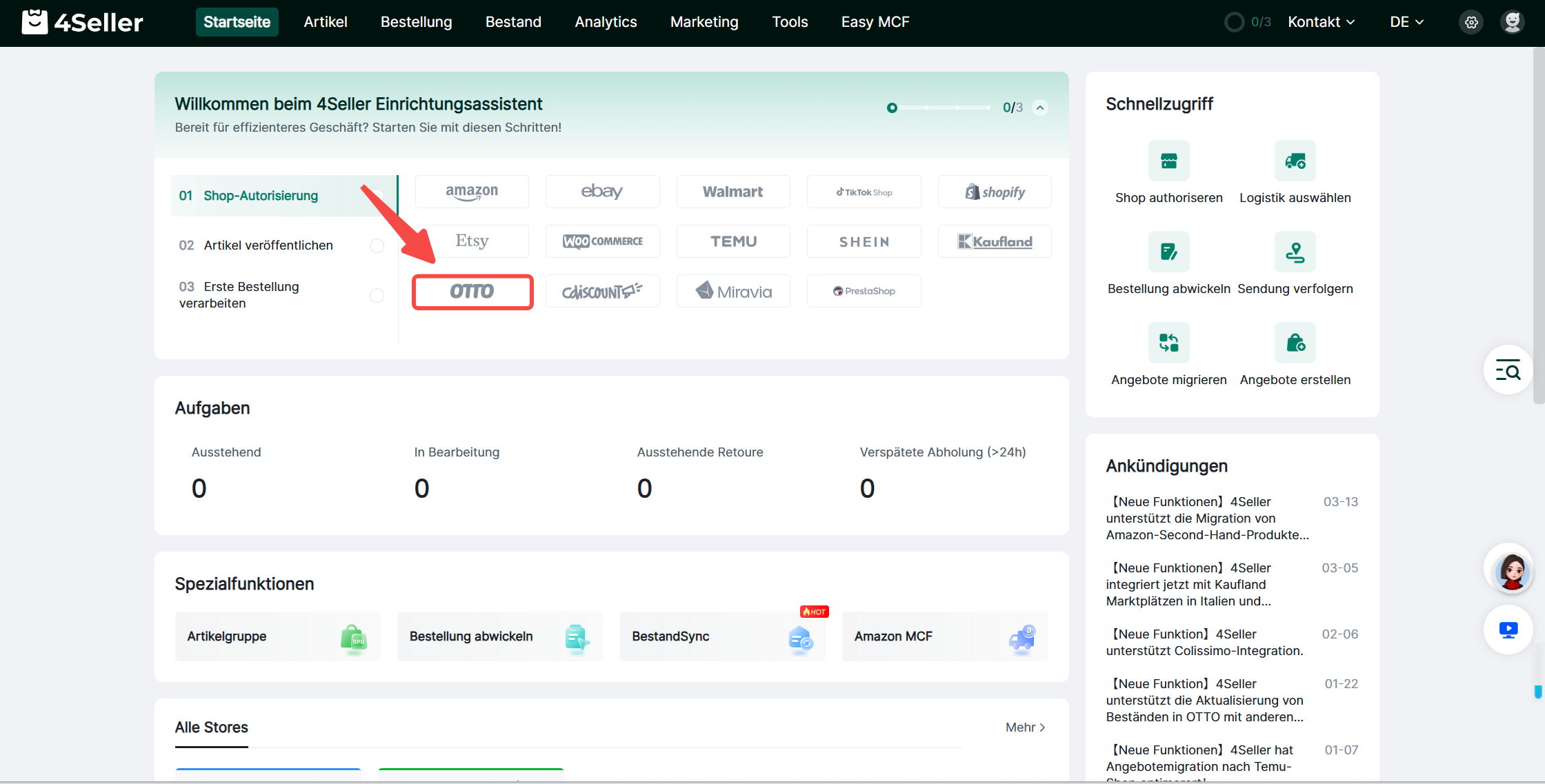 Wenn du neu bei 4Seller bist, kannst du deine Shops im Setup-Assistenten auf der 4Seller-Startseite verbinden. Klicke auf OTTO, um zur Seite „Shop-Integration” zu gelangen.