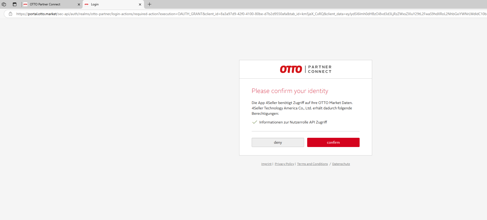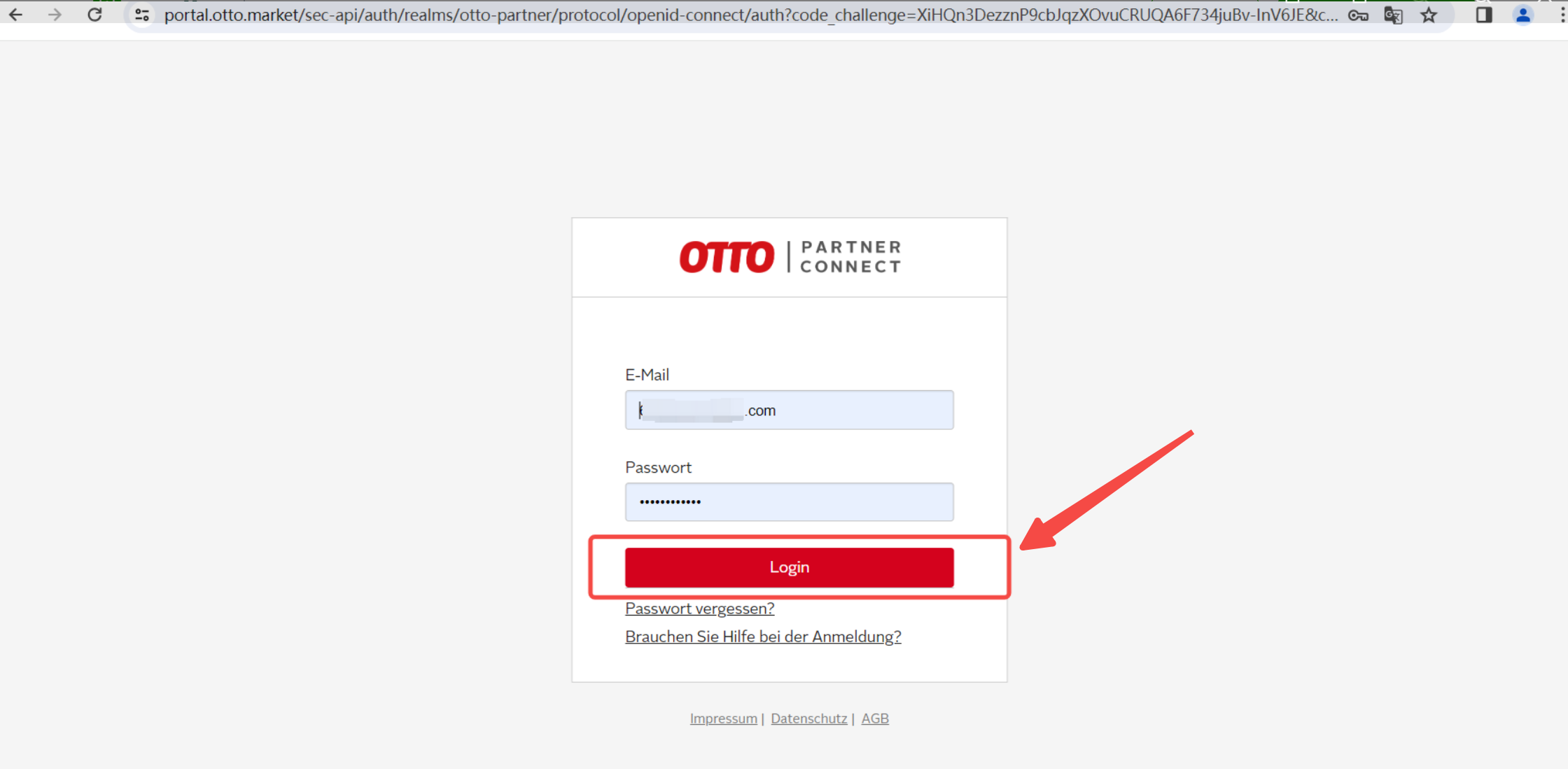 Nach dem Klick auf „Verbinden“ wirst du zur OTTO-Login-Seite weitergeleitet. Dort gibst du deine OTTO-Kontoanmeldedaten ein, um dich anzumelden. (4Seller unterstützt nur die Integration des Haupt-OTTO-Kontos.)