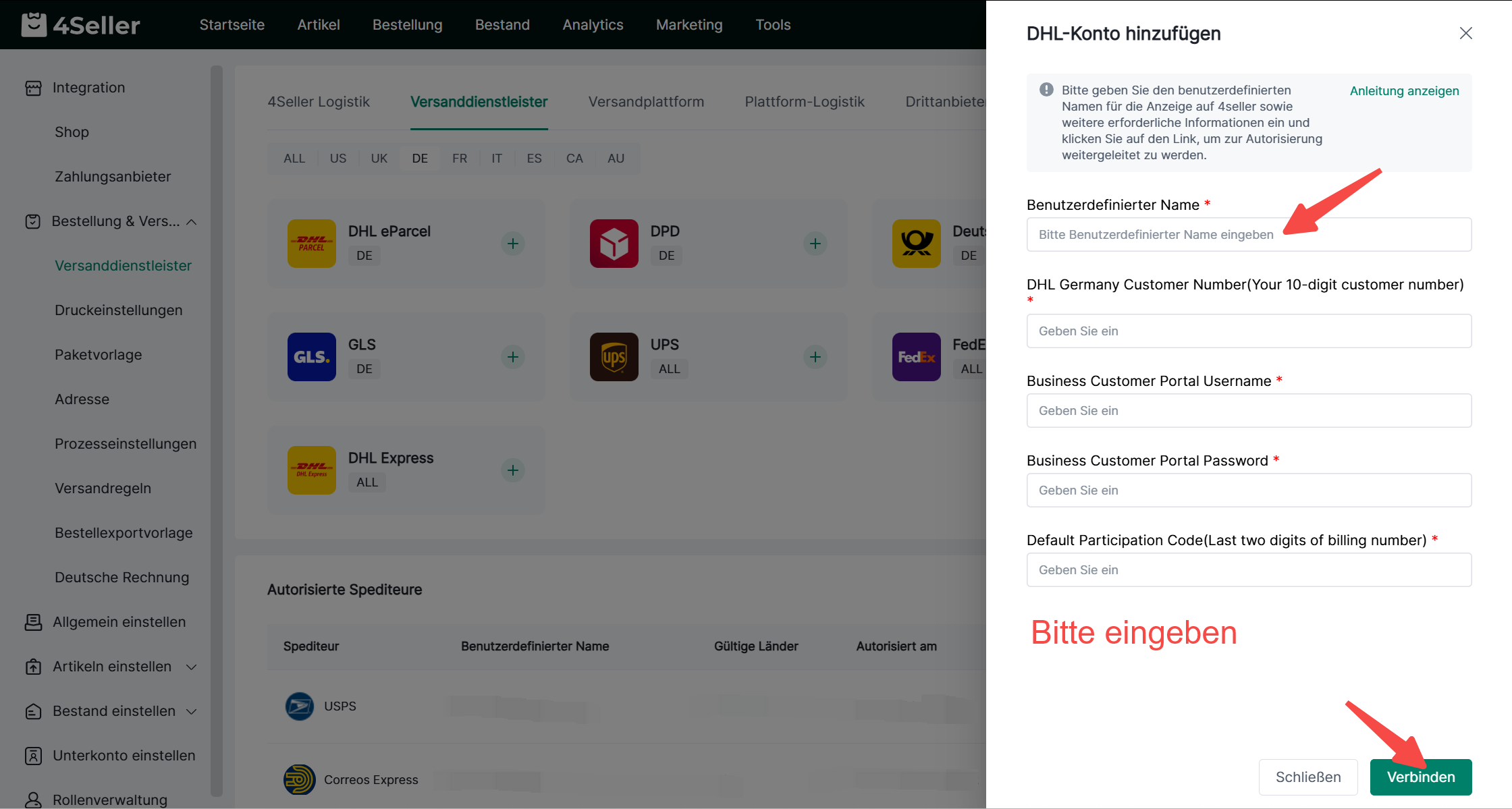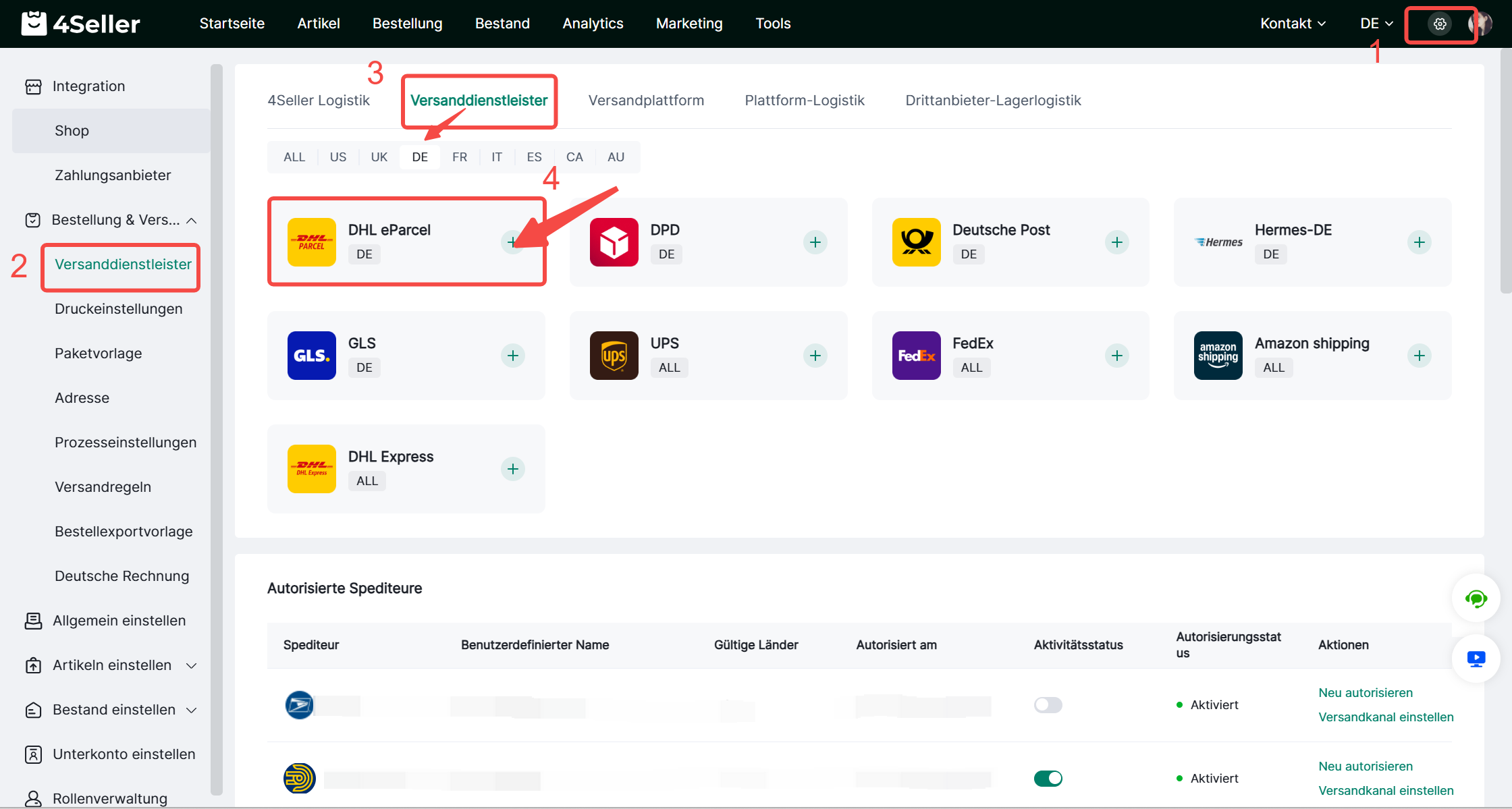 Weitere Details kannst du diesem Hilfeartikel entnehmen: Wie autorisiere ich OTTO-Shop bei 4Seller?Schritt 2: DHL mit 4Seller verbinden