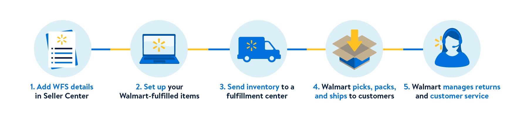 Sellers must create or update their Walmart Marketplace Seller Center account. Within the WFS section, sellers provide contact information, billing details, and return preferences. Products must be converted into Walmart-fulfilled listings, including additional attributes required by WFS.