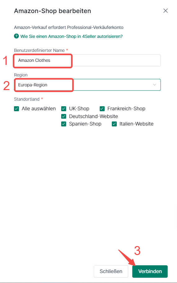 Schritt 2: Es öffnet sich ein neues Pop-up. Gebe einen benutzerdefinierten Shop-Namen ein und wähle die Region über den Amazon-Shop aus. Klicke anschließend auf Verbinden.