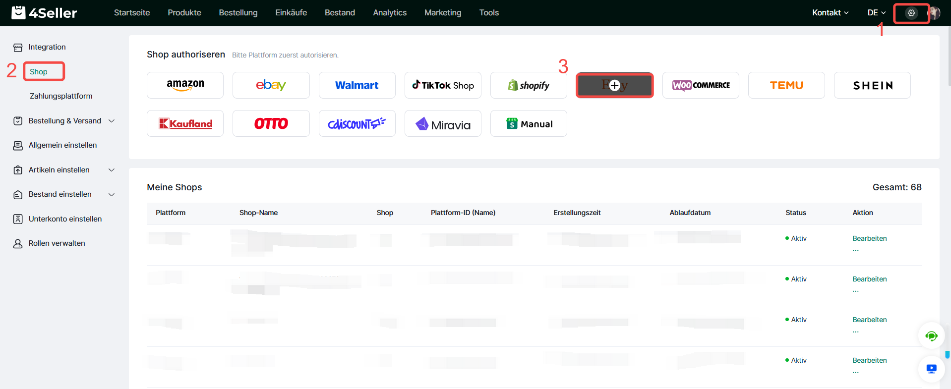 Schritt 1: Gehe zur 4Seller-Seite und melde dich an. Klicke dann auf Einstellungen und suche Shop in Integration. Klicke anschließend auf das Etsy-Symbol, um ein neüs Konto hinzuzufügen.