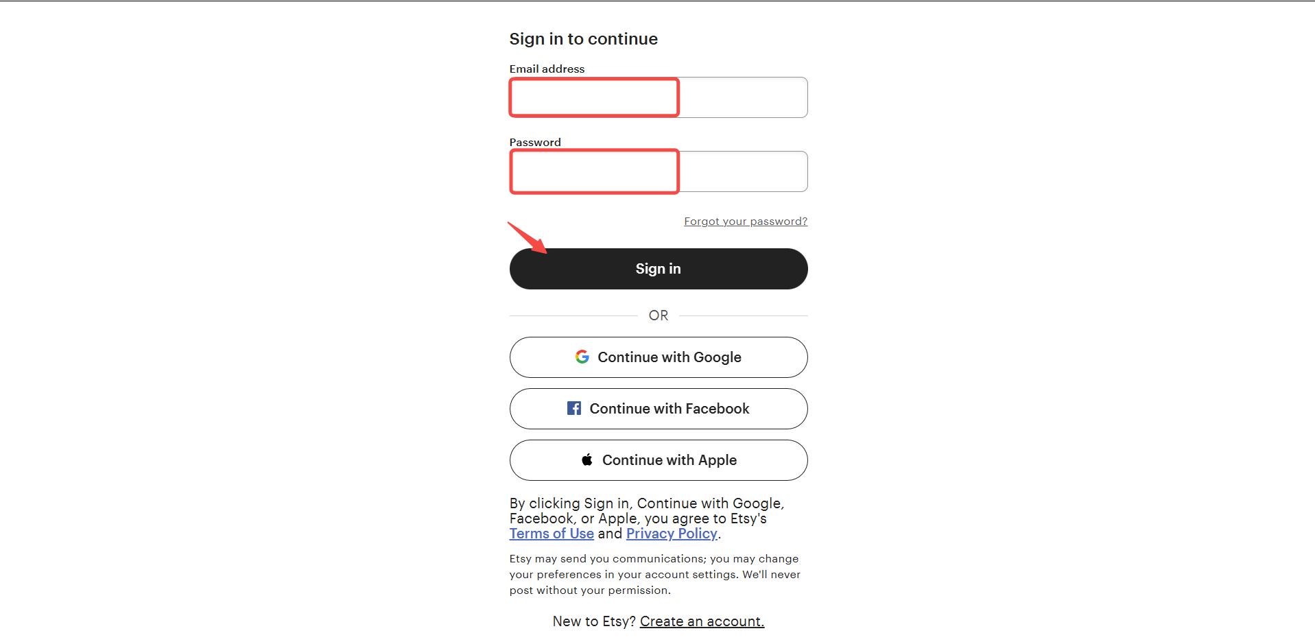 Schritt 3: Gebe deine Esty-konto ein und klicke auf Sign in.