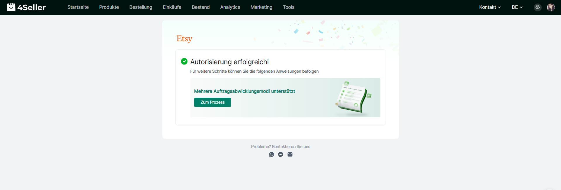 Schritt 5: Nachdem du deines Etsy-Konto bei 4Seller erfolgreich autorisiert hast, öffnet sich ein Fenster mit folgendem Screenshot.