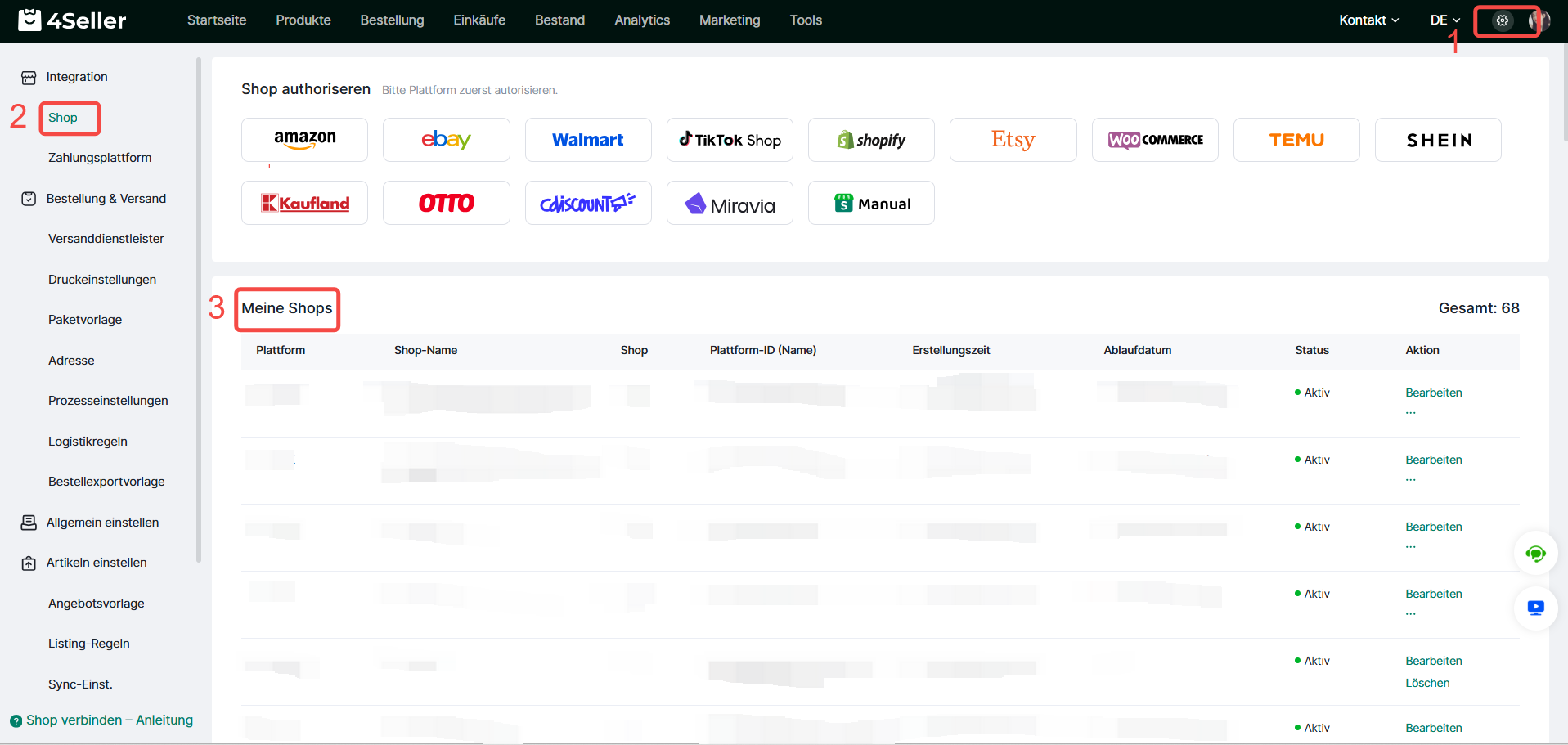 Tipp 1: Auf der Seite „Einstellungen > Integration > Shop“ kannst du folgende Informationen zu Shops einsehen.