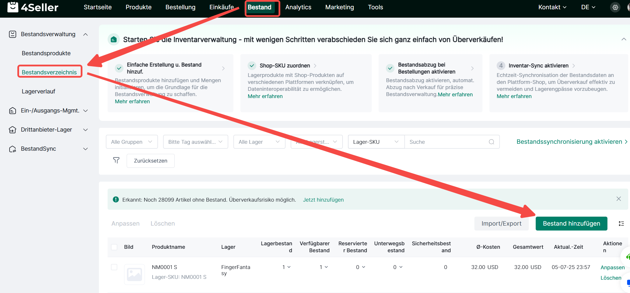 ① Bestand> Bestandsverzeichnis> Bestand hinzufügen