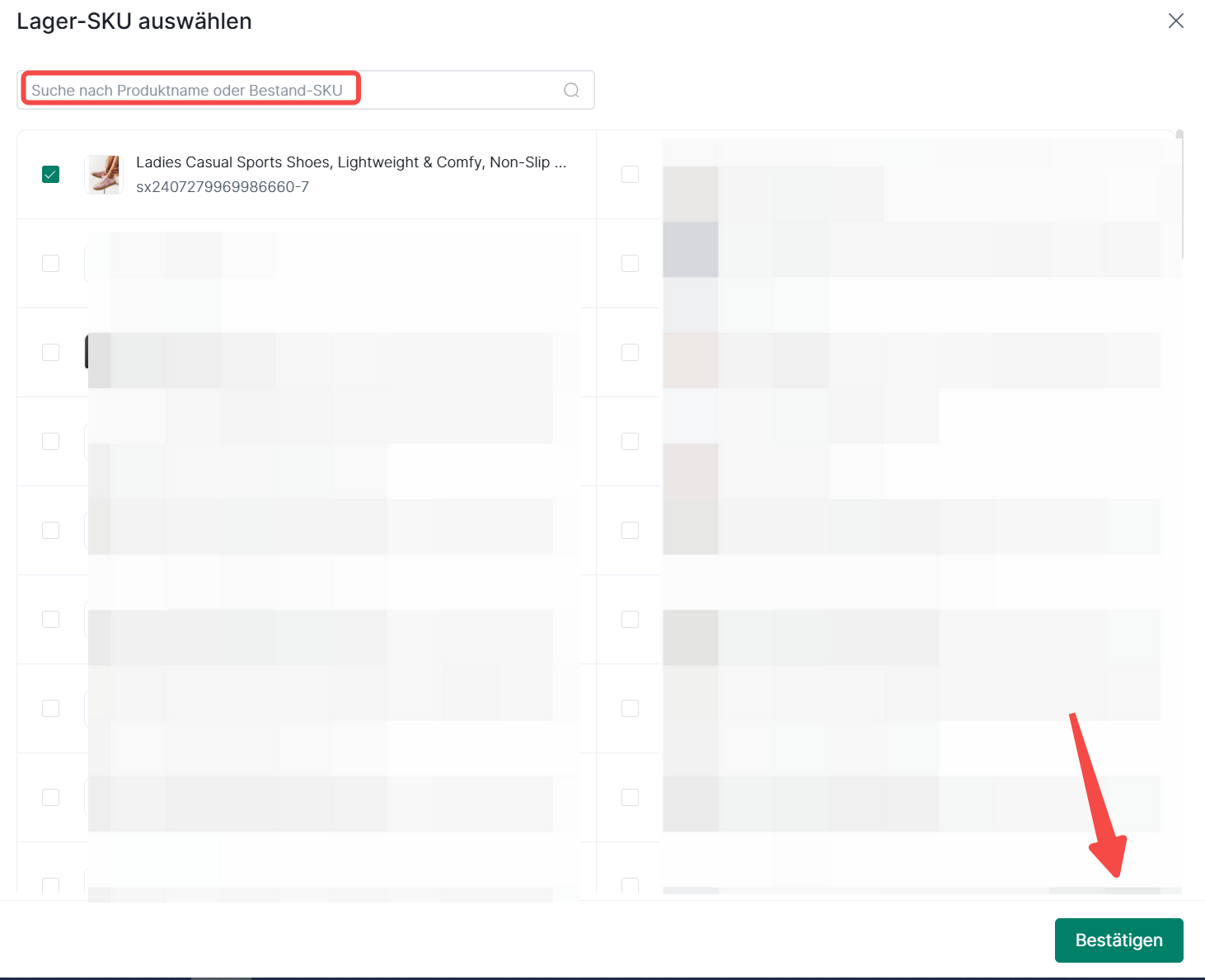 ③ Suchen Sie nach Produktname oder SKU, um SKU auszuwählen> Wählen Sie das Produkt aus, das Sie hinzufügen möchten> Bestätigen