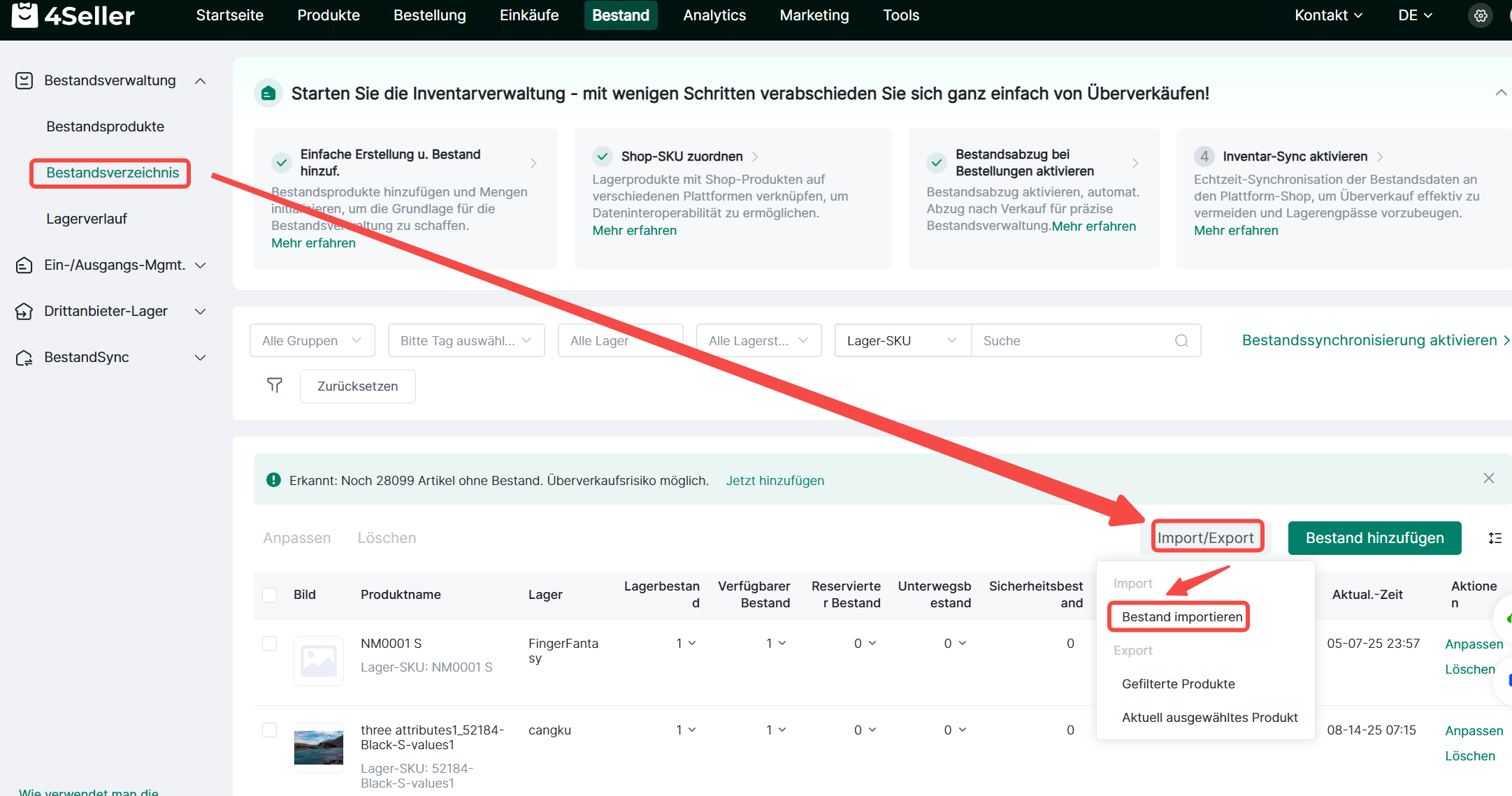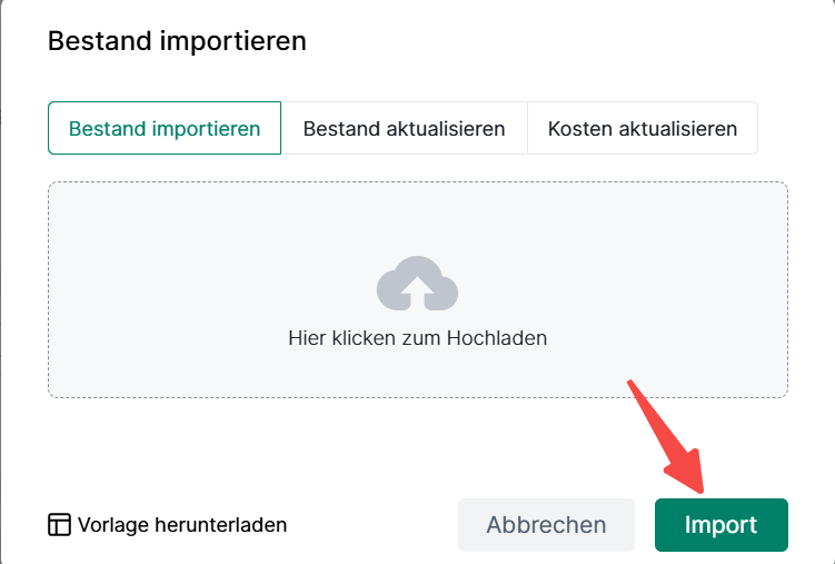 ① Gehen Sie zu Bestand> Klicken Sie auf "Bestand importieren"