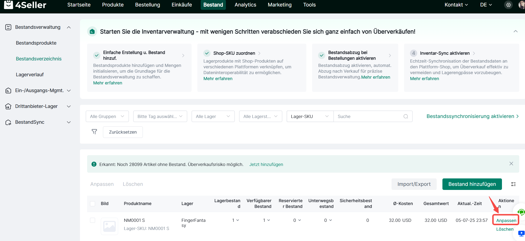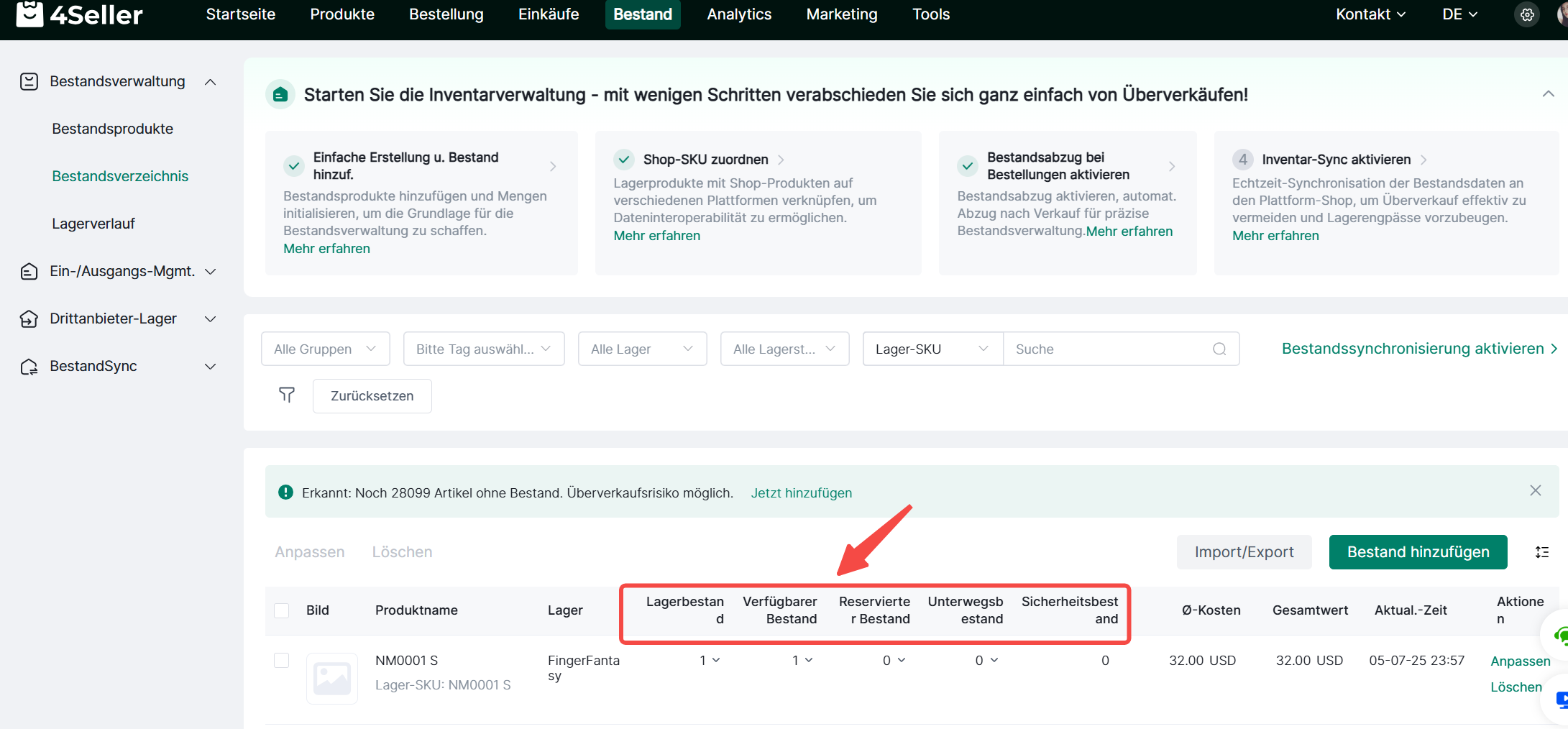 Mindestbestand (Safety Stock): Ein benutzerdefinierter sicherer Bestandswert. Wenn die Bestandsmenge unter diesen Wert fällt, generiert 4Seller eine Bestandsalarm, um Sie an die Auffüllung des Bestands zu erinnern.