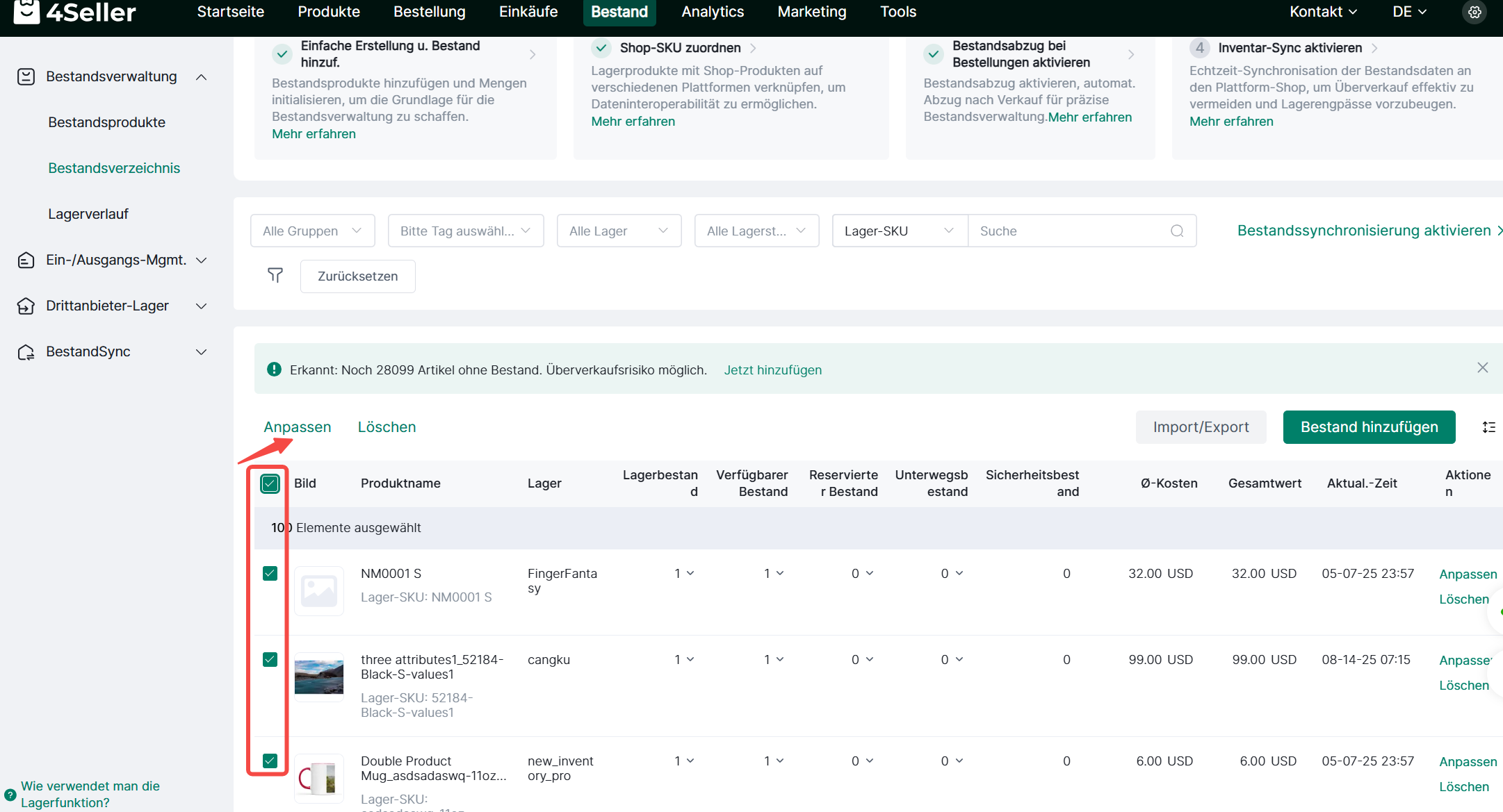 ① Wählen Sie mehrere SKUs aus, um Bestand hinzuzufügen> Klicken Sie auf Anpassen, um alle SKU-Informationen in der Liste stapelweise zu bearbeiten, einschließlich On-Hand-Menge und Stückkosten.
