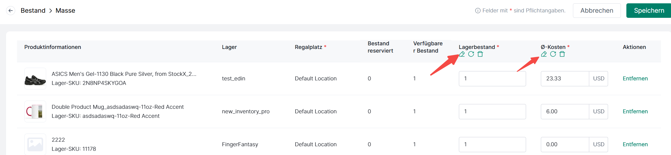 Klicken Sie auf Anpassen, um die Bestandsinformationen einschließlich Standort, On-Hand-Menge und Durchschnittskosten anzupassen