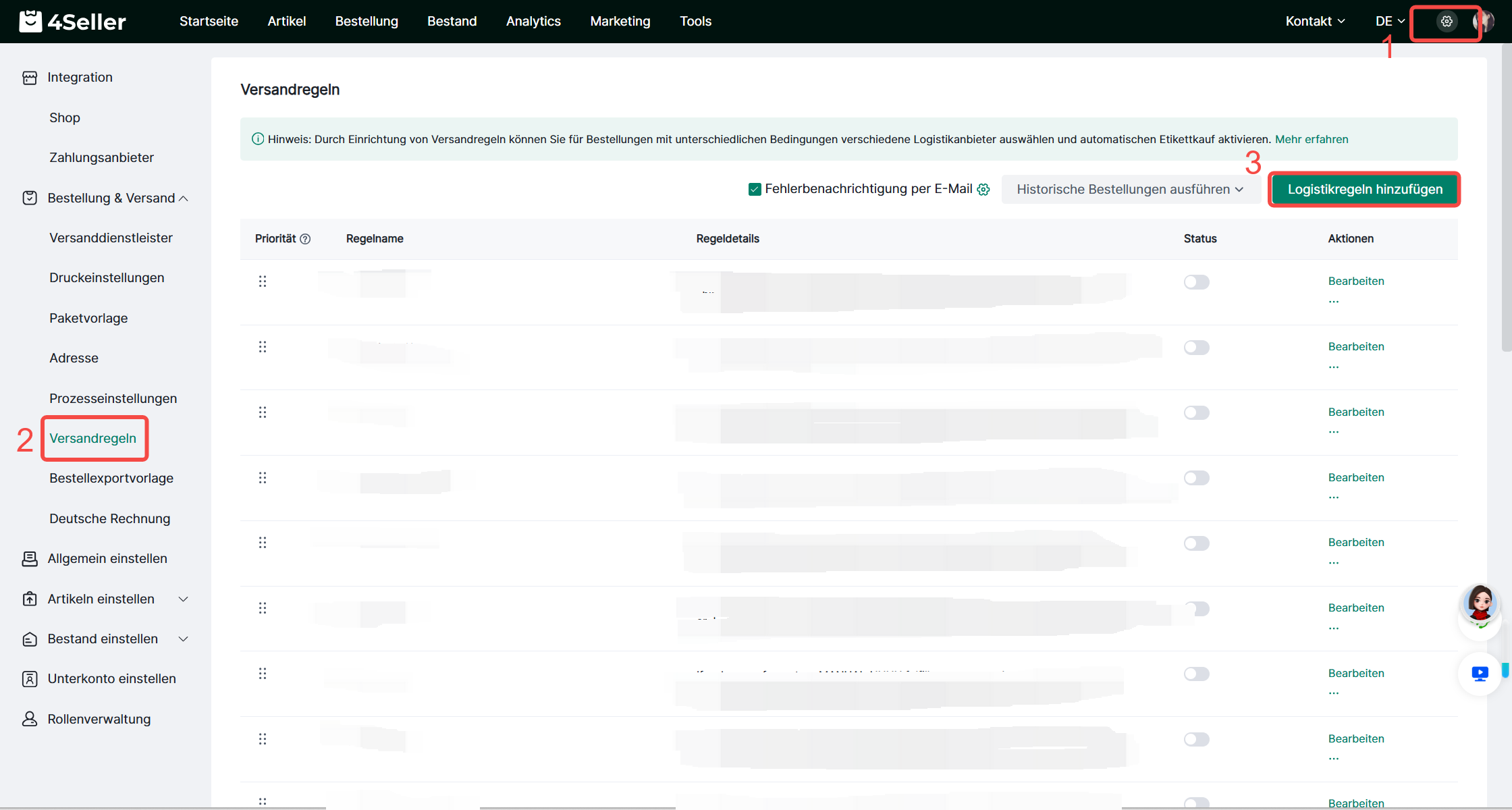 Hinweis 3: PrioritätsverwaltungZiehen Sie die Quadrate in der Prioritätsliste nach oben/unten, um die Ausführungsreihenfolge der Logistikregeln anzupassenKundensupport: Solltest du Probleme bei dieser Process haben, bitte kontaktiere uns unter: support@4seller.com