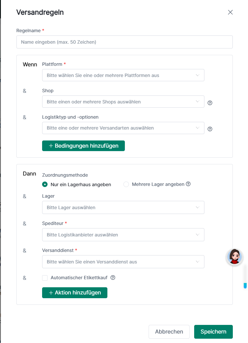 ② Fülle die Felder für Regelname, Plattform, Shop, Versandoption, Lager, Spediteur und Versanddienst (Rot markiert) aus.