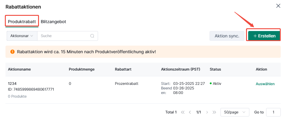 Über „Erstellen“ können Sie neue Aktionen anlegen (Shop-Info, Name, Zeitraum [max. 30 Tage], Rabattart). Erfolgreich erstellte Aktionen erscheinen im Auswahlmenü.