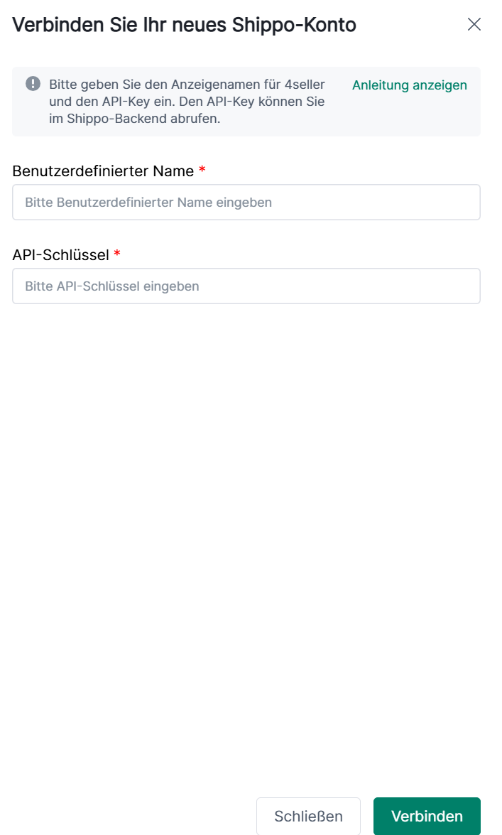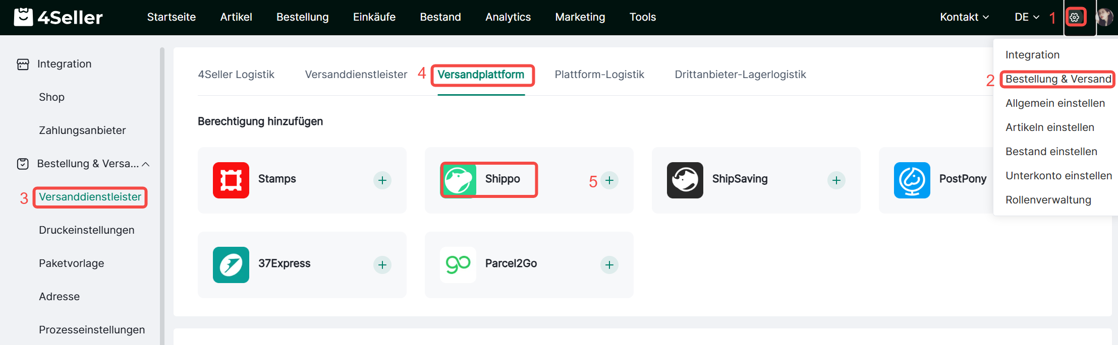 Klicke auf Einstellungen und suche Versanddienstleister in Bestellung&Versand. Klicke anschließend auf das Shippo-Symbol, um ein neüs Konto hinzuzufügen.Schritt 7: Es öffnet sich ein neüs POP-UP. Gebe dort den Name and API-Schlüssel ein. Bestätige Informationen und klicke auf Verbinden.