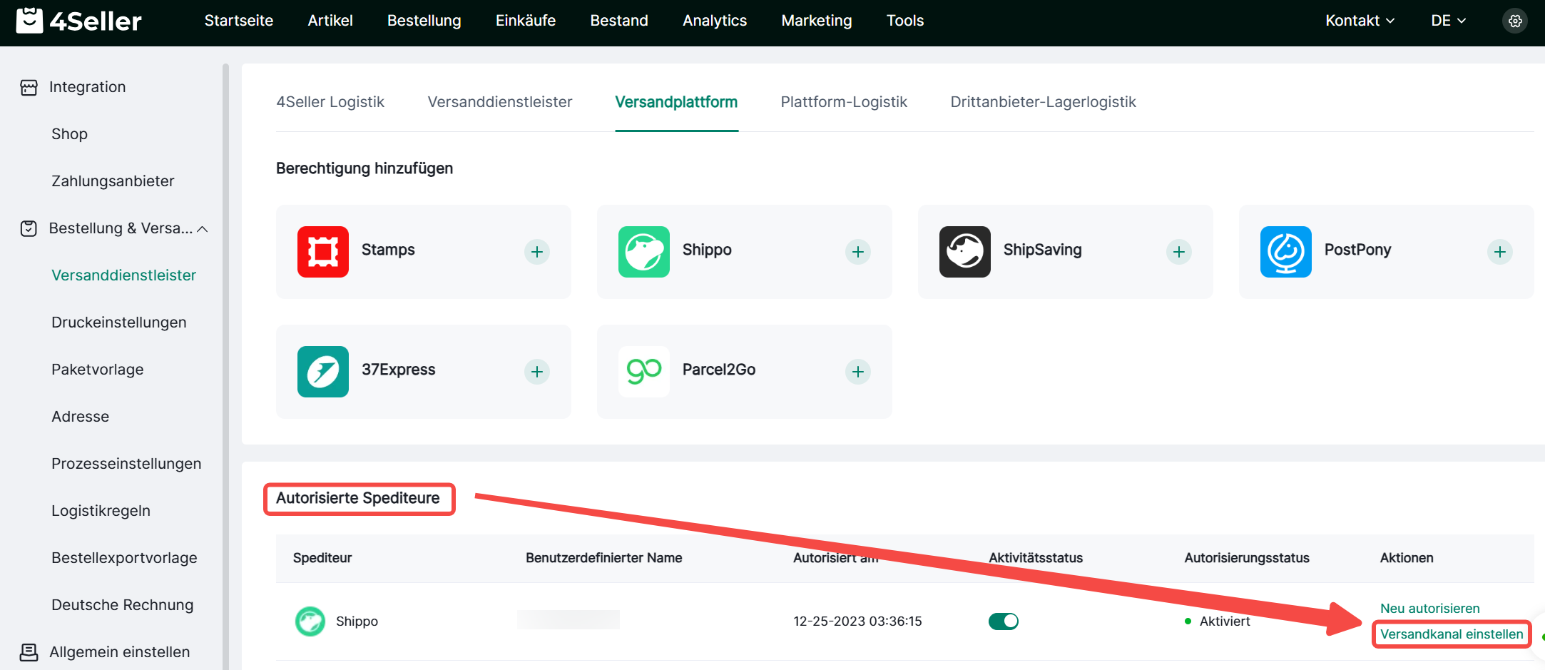 Tipp 2: Klicke auf Versandkanal einstellen, kannst du Versandarten auswählen.