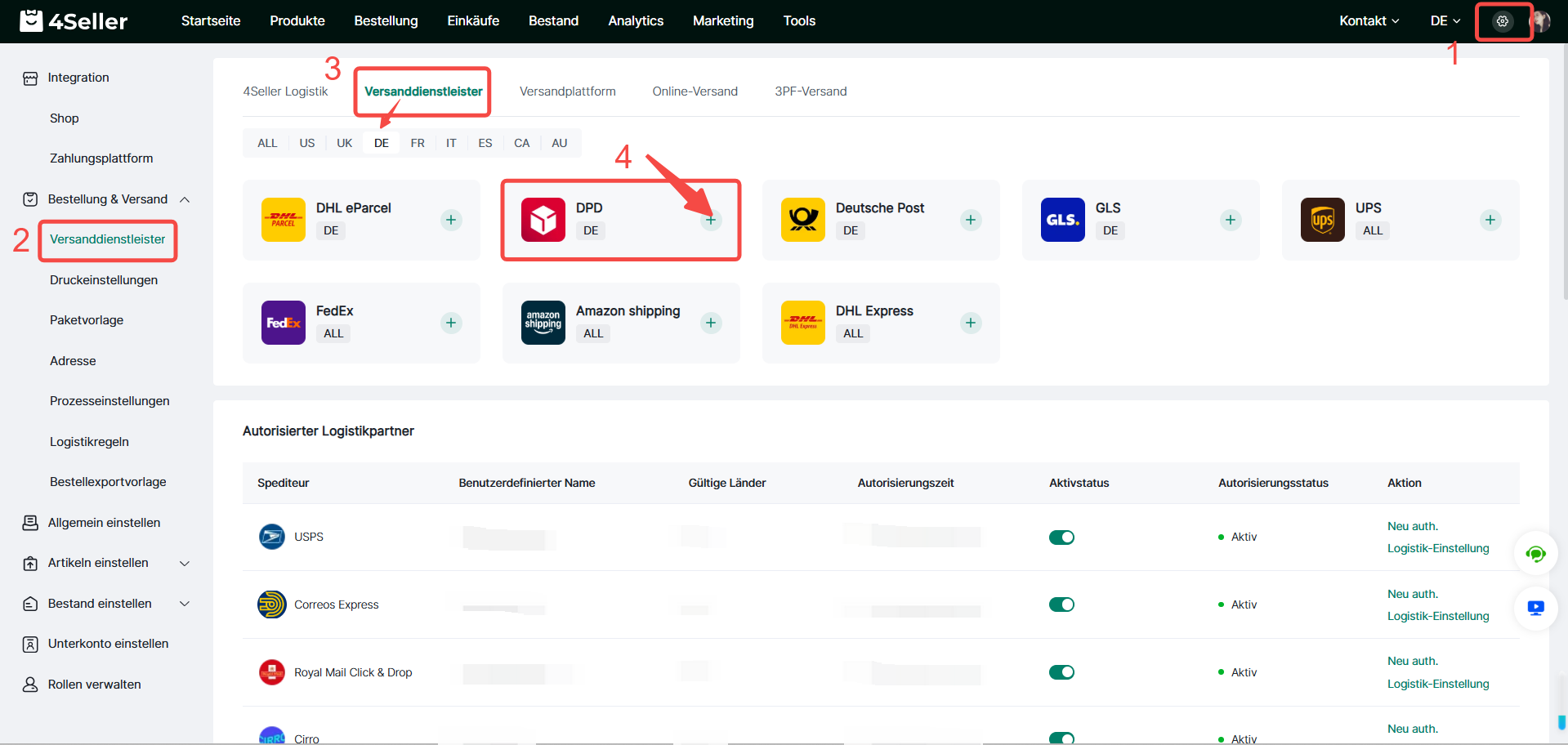 Du kannst dein DPD DE-Konto mit 4Seller verbinden. So kannst du schnell Versandetiketten erstellen und Bestellungen abwickeln.