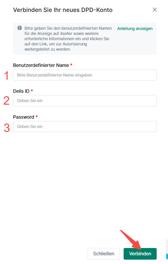 Schritt 2: Es öffnet sich ein neüs POP-UP. Gebe dort den Name, Delis ID and Password ein. Diese Informationen kannst du nach DPD-Support erhalten. Sie werden Ihnen ein Dukument wie fogendes darestellen.