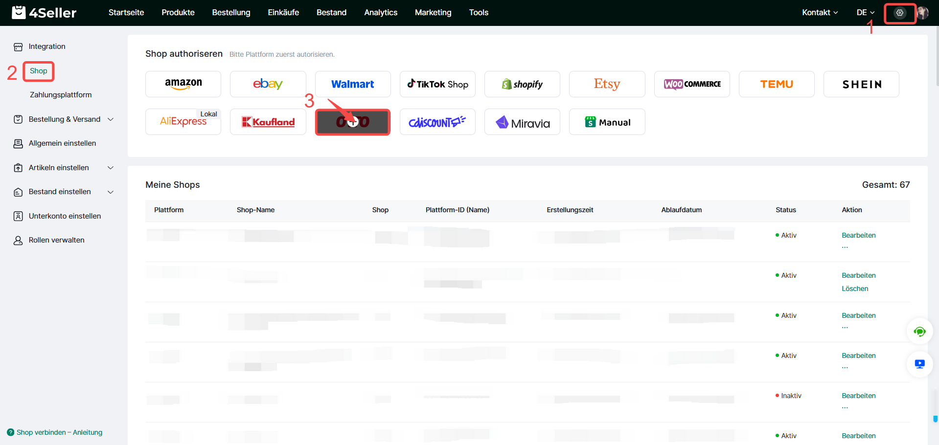 Tipp 1: Auf der Seite „Einstellungen > Integration > Shop“ kannst du folgende Informationen zu Shops einsehen.