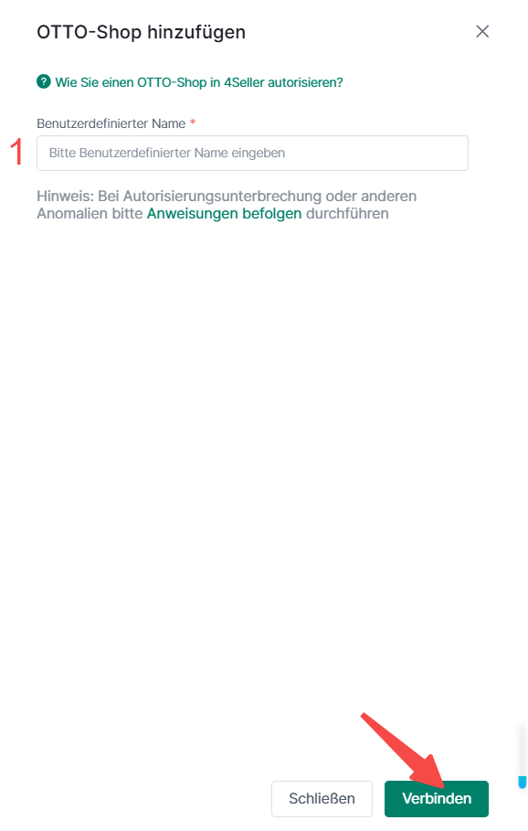 Schritt 2: Es öffnet sich ein neues Pop-up. Gebe einen benutzerdefinierten Shop-Namen ein und klicke anschließend auf Verbinden.Schritt 3: Melde dich in deinem Otto-Konto auf dieser Seite an.