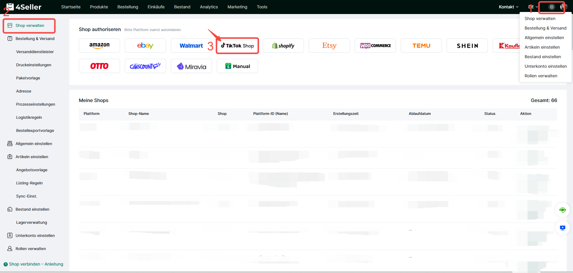 Hinweis: Wenn du 4Seller mit deinem TikTok-Konto verbinden möchtest, solltest du das primäre Konto und nicht ein Unterkonto verwenden. Falls du ein Unterkonto benutzt, musst du zunächst zum primären Konto wechseln.Schritt 1: Gehe zur 4Seller-Seite und melde dich an. Klicke dann auf Einstellungen und suche Shop in Integration. Klicke anschließend auf das Miravia-Symbol, um ein neüs Konto hinzuzufügen.