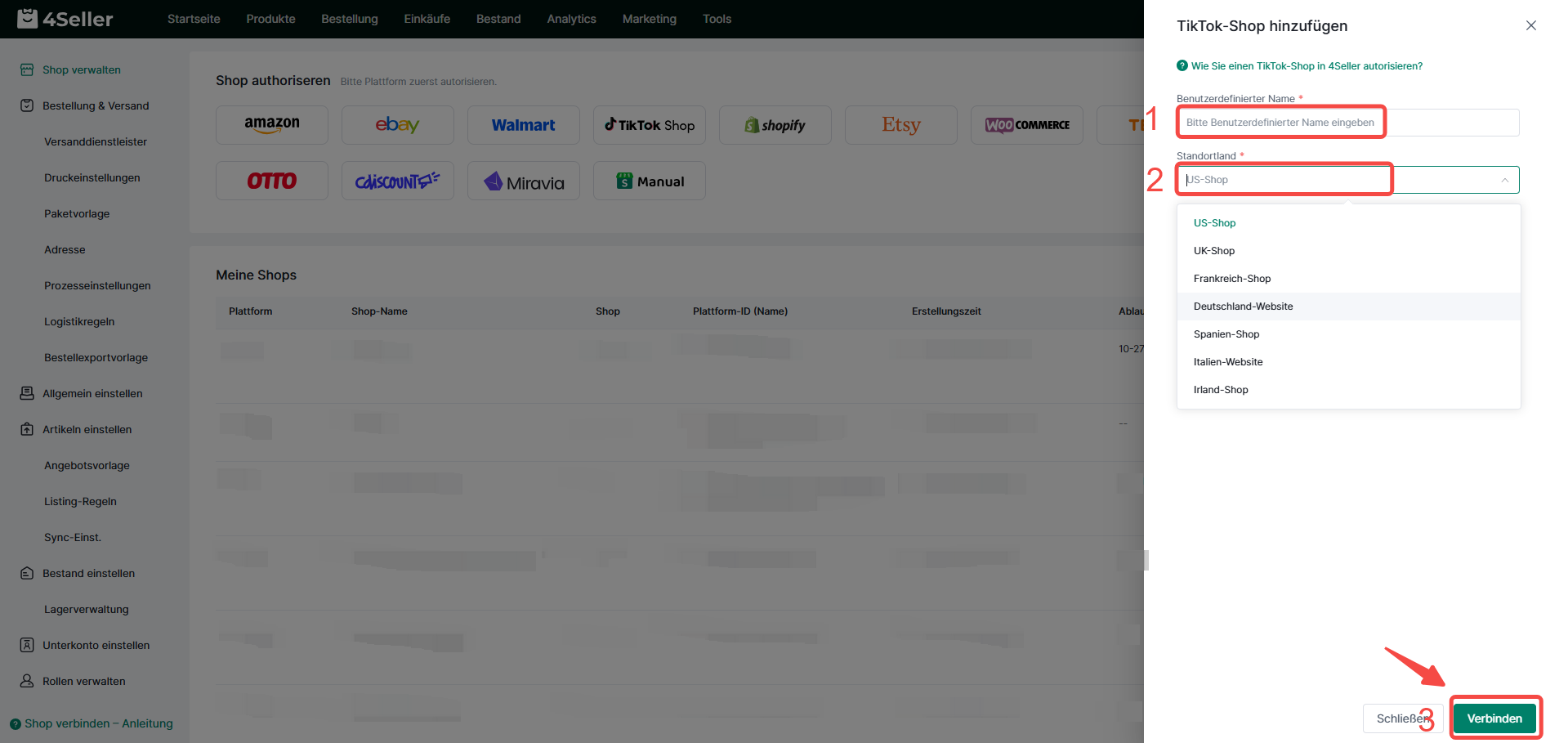 Schritt 2: Eine neue Pop-up wird oeffnet. Dort kannst du einen benutzerdefinierten Shop-Namen eingeben. Nach dem Klicken auf Verbinden werdest du automatisch zur Autorisierungsseite im TikTok Autorisierungsseite weitergeleitet.
