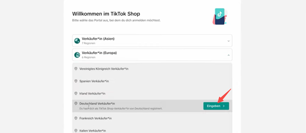 Schritt 3: Wenn du auf der Autorisierungsseite im TikTok Verkäufercenter angekommen bist, wähle entsprechende Standort aus und klicke dann auf Eingeben.