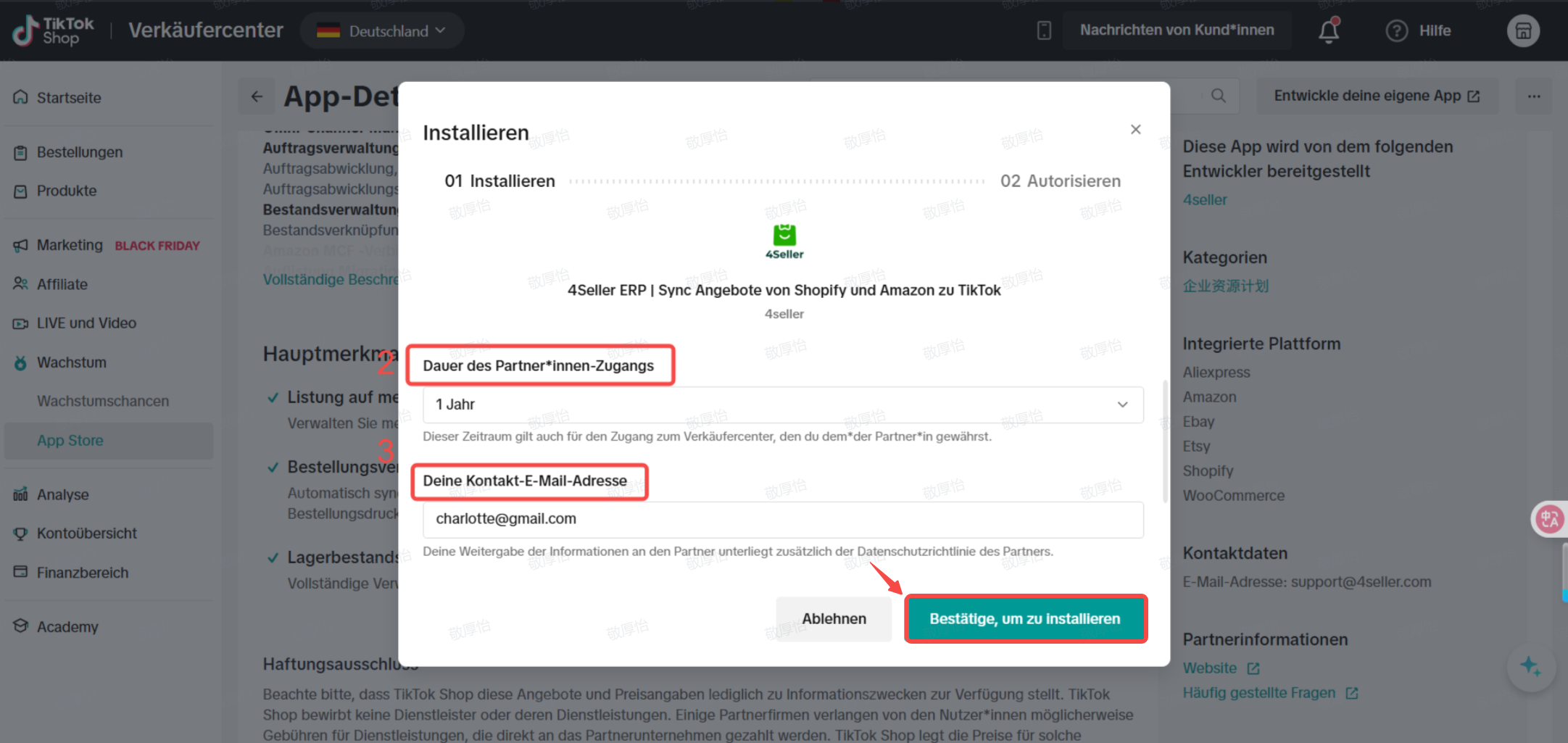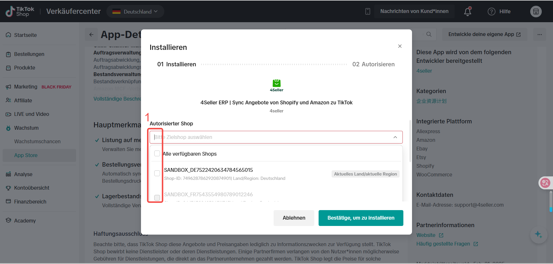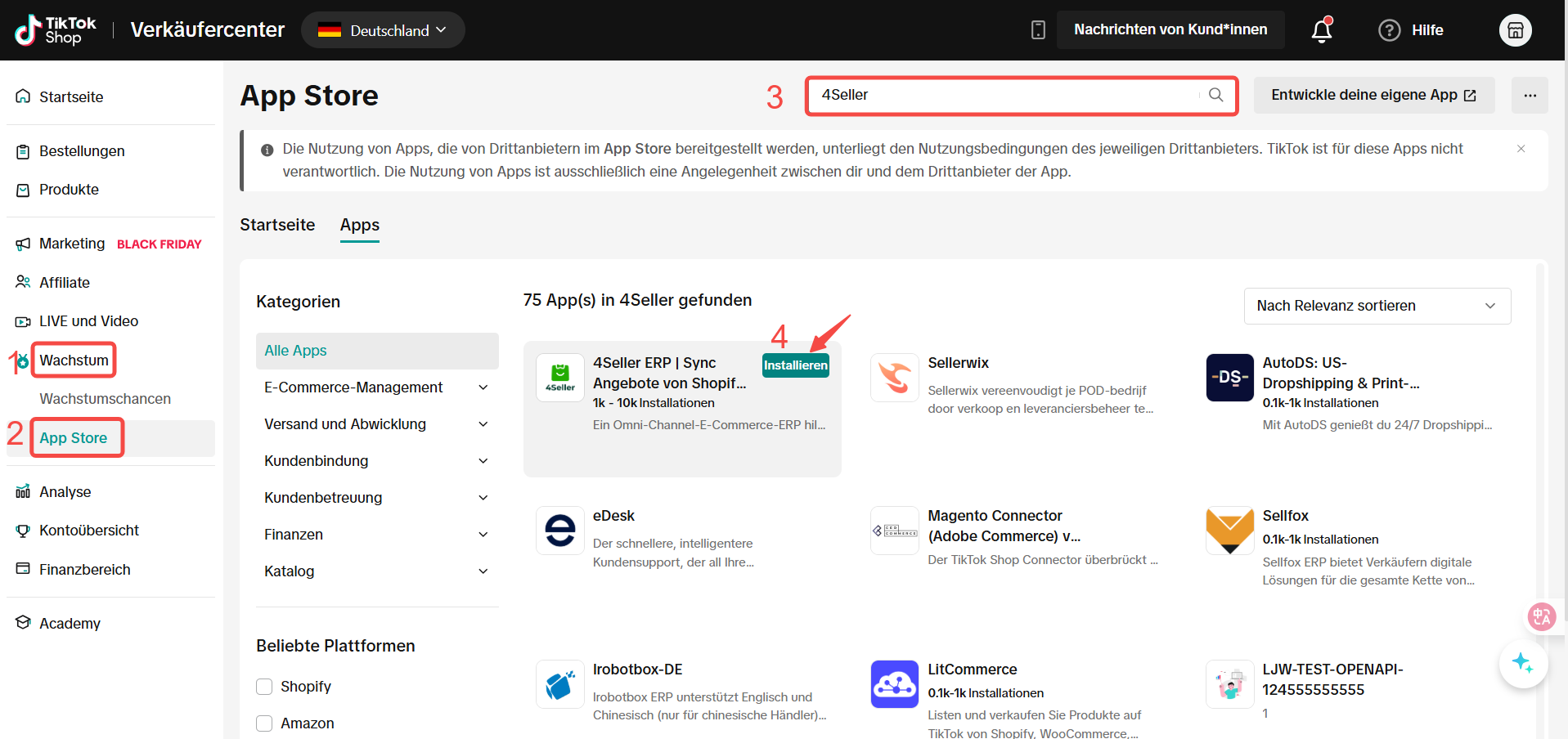 Dann suche nach 4Seller und klicke auf Installieren.Schritt 5: Auf der Seite Verkäufercenter musst du die folgenden Schritte ausführen: