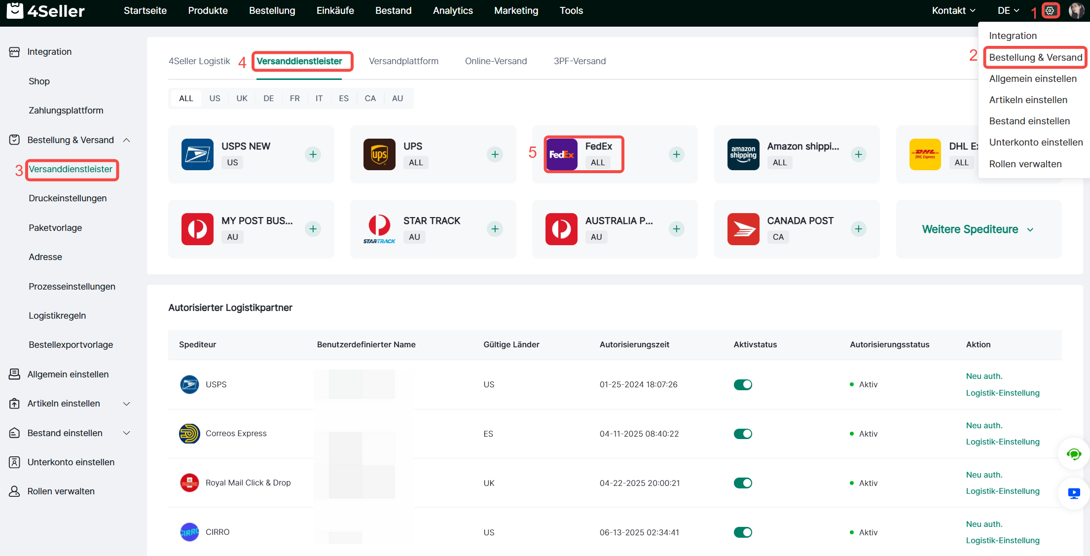 Schritt 1: Einstellungen > Bestellung&Versand>Versanddienstleister > FedEx