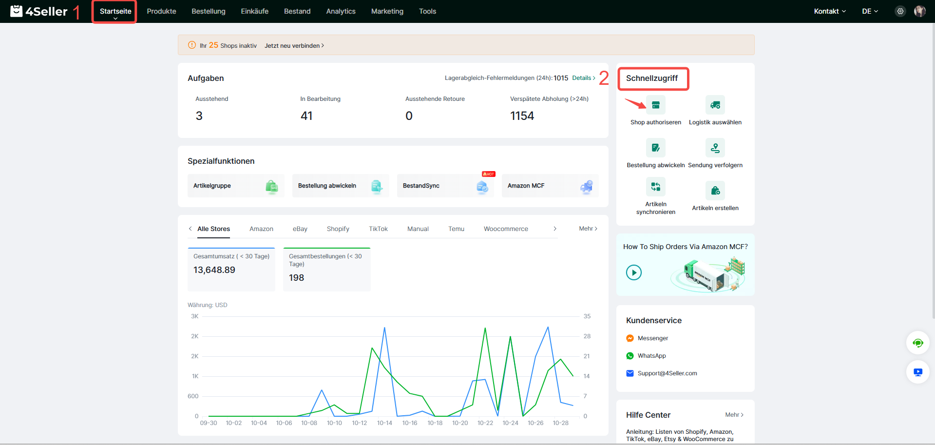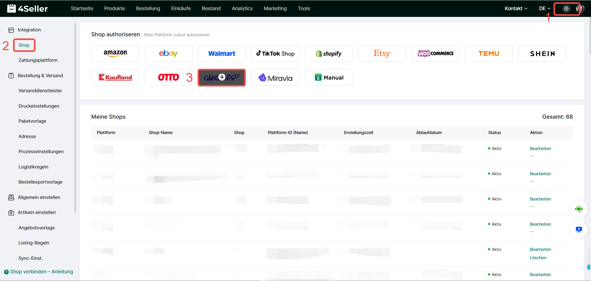Schritt 1: Nachdem du im 4Seller angemelden hast, kannst du Shop authorisieren im Zugriff Modus klicken. Danach wirdst du zur Shop-Verwaltungsseite gehen.