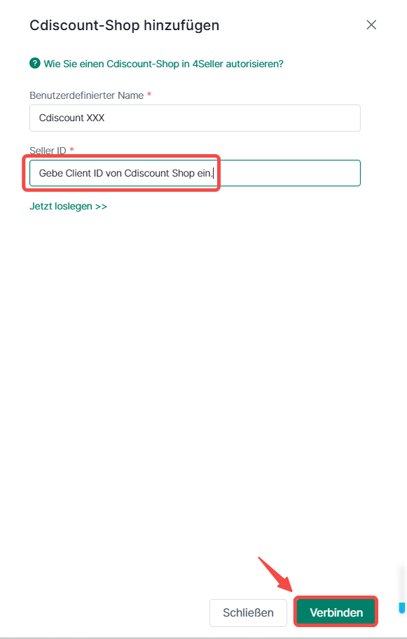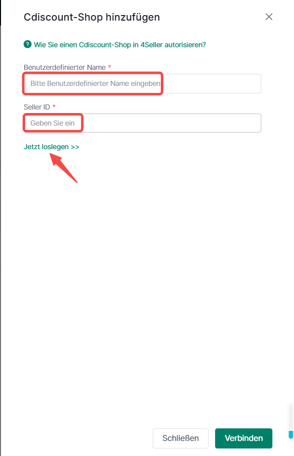 Auf 4Seller kannst du die autorisierte Cdiscount-Seite auf zwei Moelichkeiten erreichen.Zugang 1: Startseite - Schnellzugriff - Shop authorisieren - Cdiscount SymbolAuf der Startseite findest du den Schnellzugriff. Dann klicke auf Shop autorisieren. Danach wirst du zur Shop-Verwaltungsseite weitergeleitet. Auf dieser Seite kannst du auf das Cdiscount-Symbol klicken und Verbindung abschließen.Zugang 2: Einstellungen - Shop authorisieren - Cdiscount SymbolEine einfache Methode als Eingang 1 ist, dass du kannst auf Einstellungen in der Funktionsleiste oben klicke. Dann gehe zur Shop-Verwaltungsseite. Auf dieser Seite kannst du auf das Cdiscount-Symbol klicken und Verbindung erledigen.