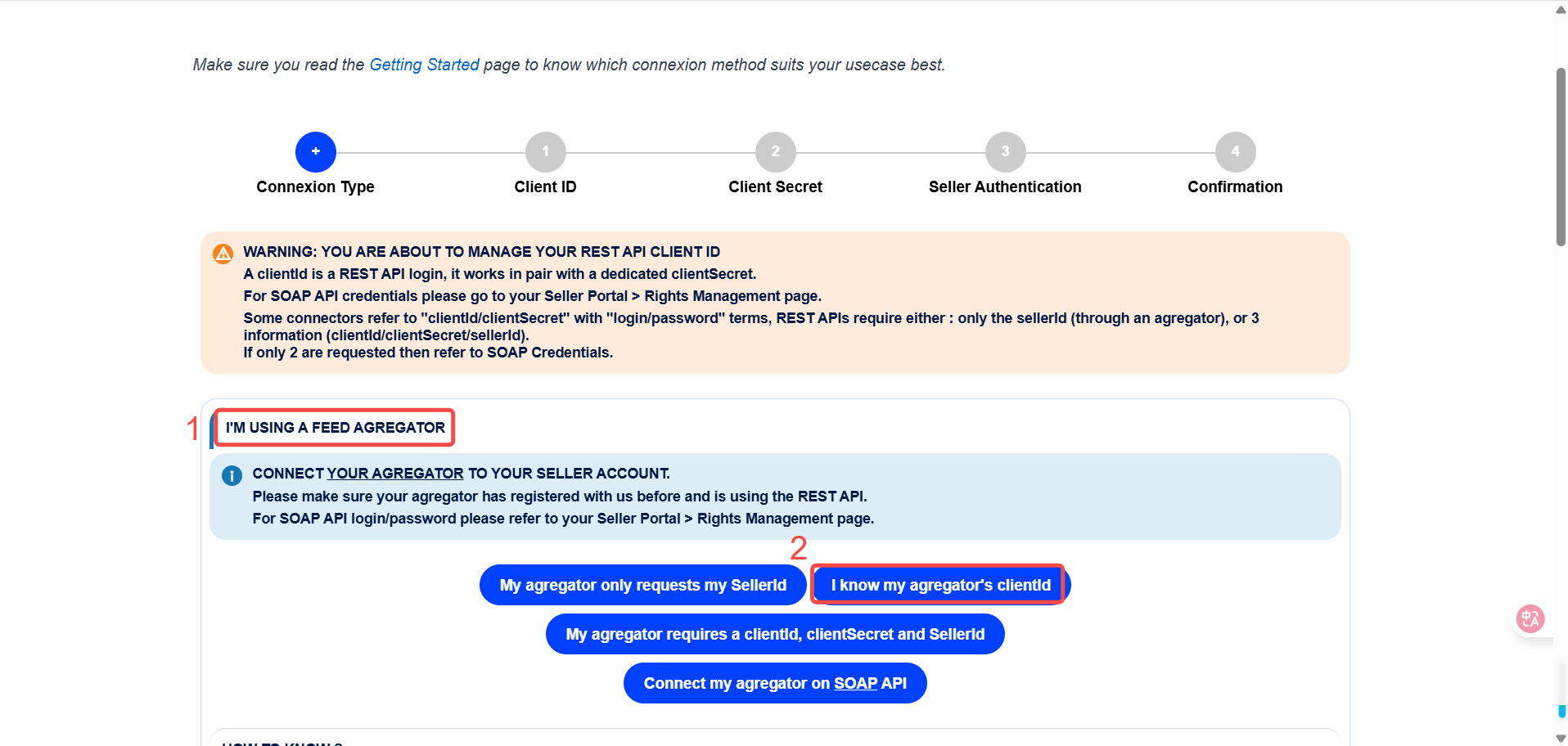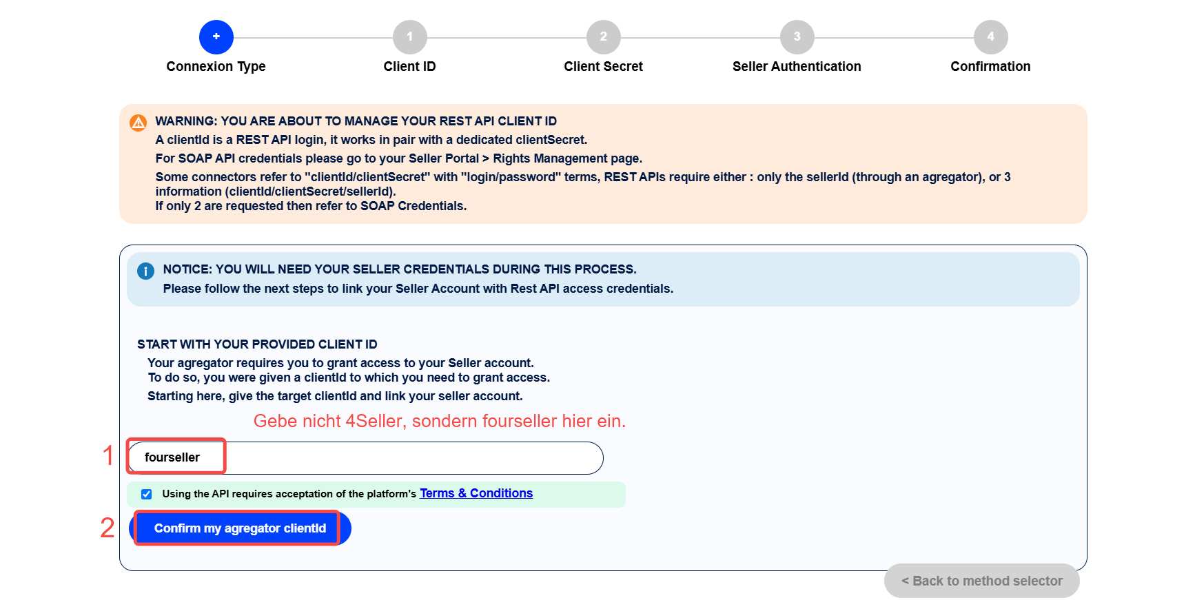 Schritt 4: Gebe fourseller ein (beachte nicht 4Seller). Klicke auf Confirm my agregator clientID.