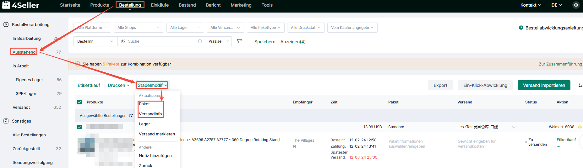 Wählen Sie mehrere Bestellungen aus und aktualisieren Sie Paket- und Versandinformationen über „Stapelmodif“.