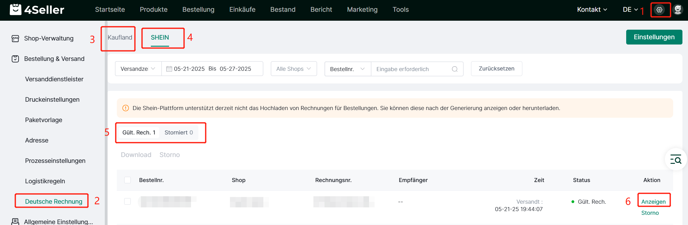 Hinweis: Bei der Autorisierung von Kaufland- oder Shein DE-Stores wird der Menüpunkt „Deutsche Rechnung“ freigeschaltet.Einstellungen → Deutsche Rechnung → Einstellungen