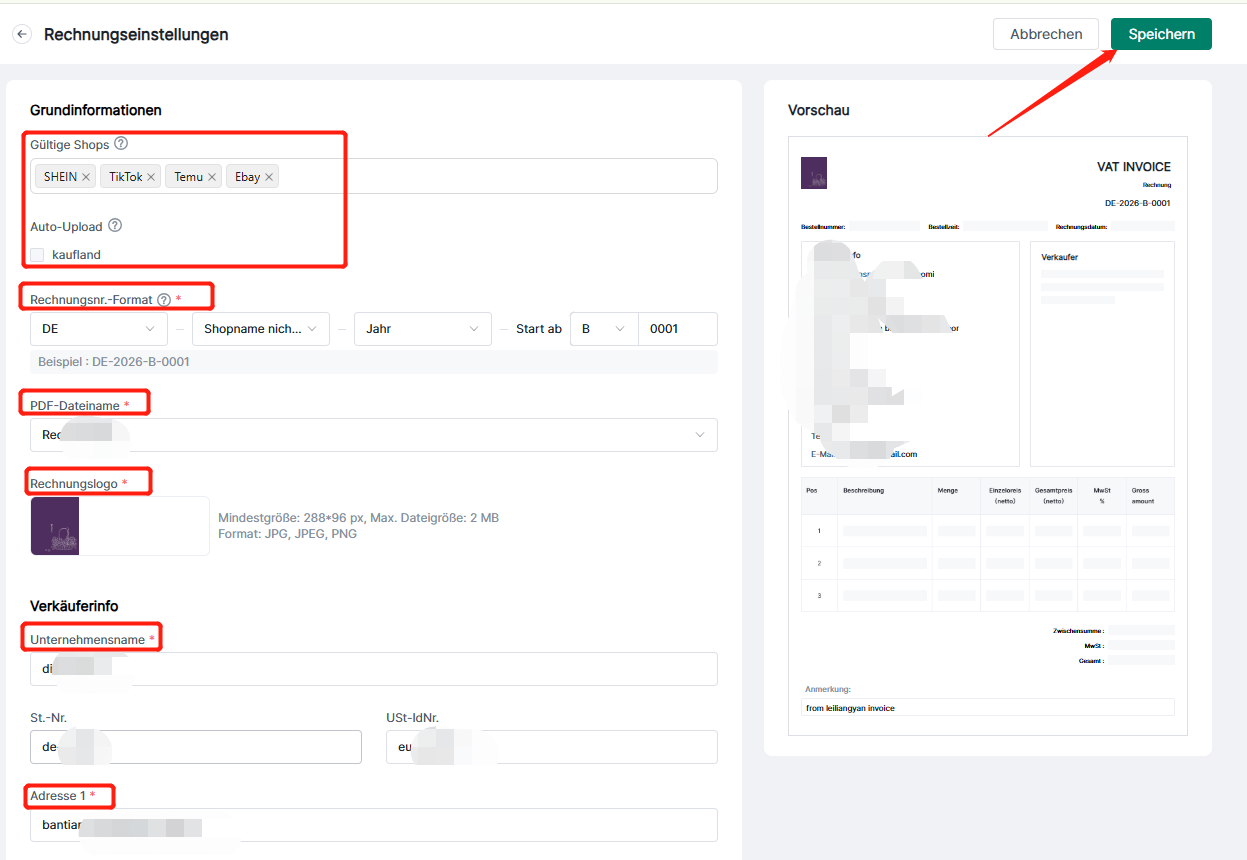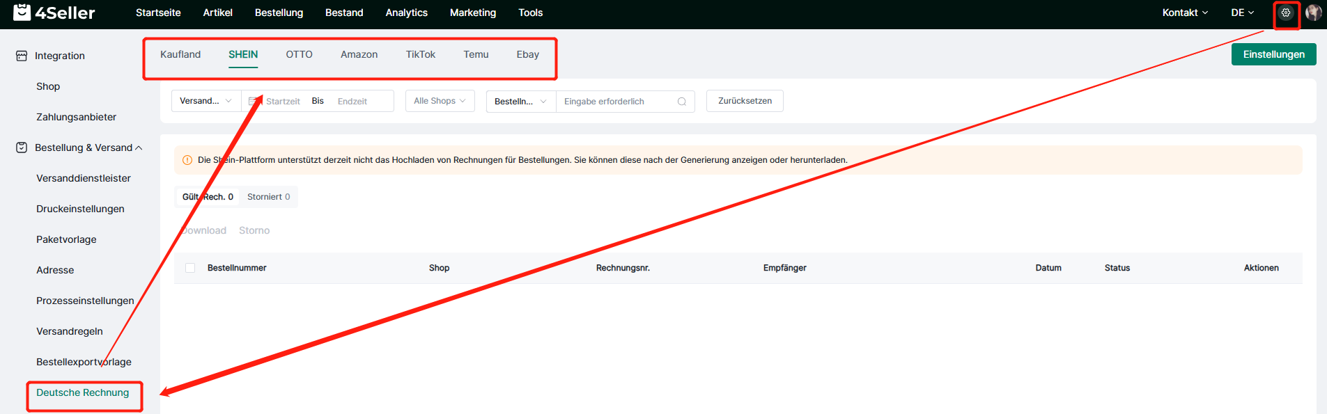 Hinweis: Wenn du Kaufland, Shein, TikTok, OTTO, eBay, Amazon, TEMU für 4Seller autorisierst, wird auf der Einstellungsseite der Eintrag „Deutsche Rechnung“ angezeigt.