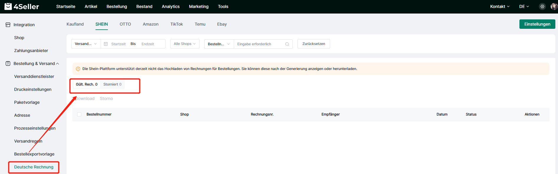 4Seller unterstützt jetzt die Einrichtung von Rechnungen für Kaufland, Shein, TikTok, OTTO, eBay, Amazon und TEMU. Kaufland-Rechnungen werden beim Versand automatisch hochgeladen, Shein-Rechnungen können generiert, heruntergeladen und gedruckt werden.