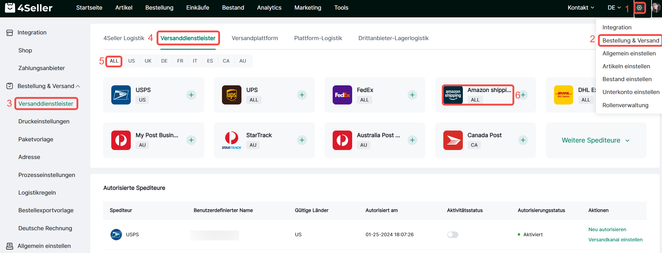 4. Unter Logistikeinstellungen können Sie benötigte Versanddienstleister auswählen und mit Speichern für zukünftige Etikettenerstellung freischalten!