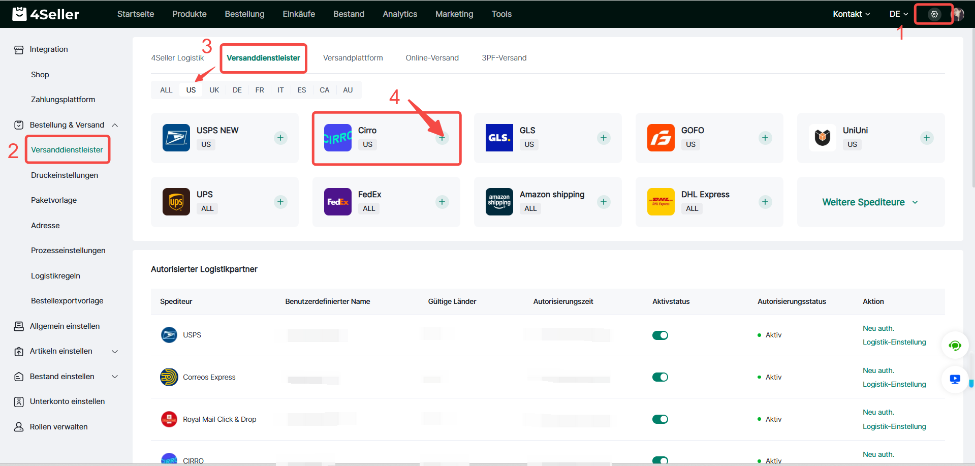 Klicke auf Einstellungen und suche Versanddienstleister in Bestellung&Versand. Klicke anschließend auf das Cirro-Symbol, um ein neüs Konto hinzuzufügen.