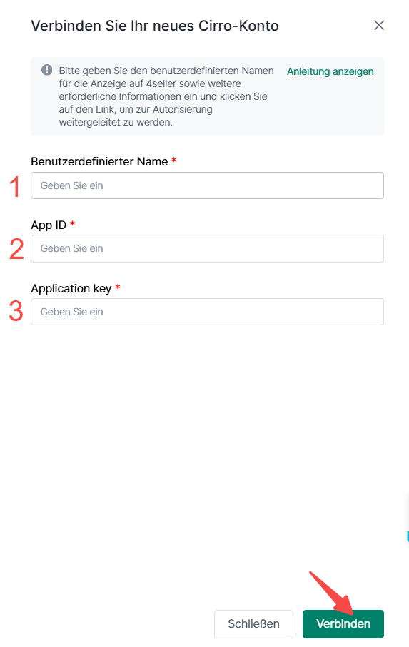 Schritt 2: Es öffnet sich ein neüs POP-UP. Gebe dort den Name, App ID, Application Key, ein. Bestätige Informationen und klicke auf Verbinden.
