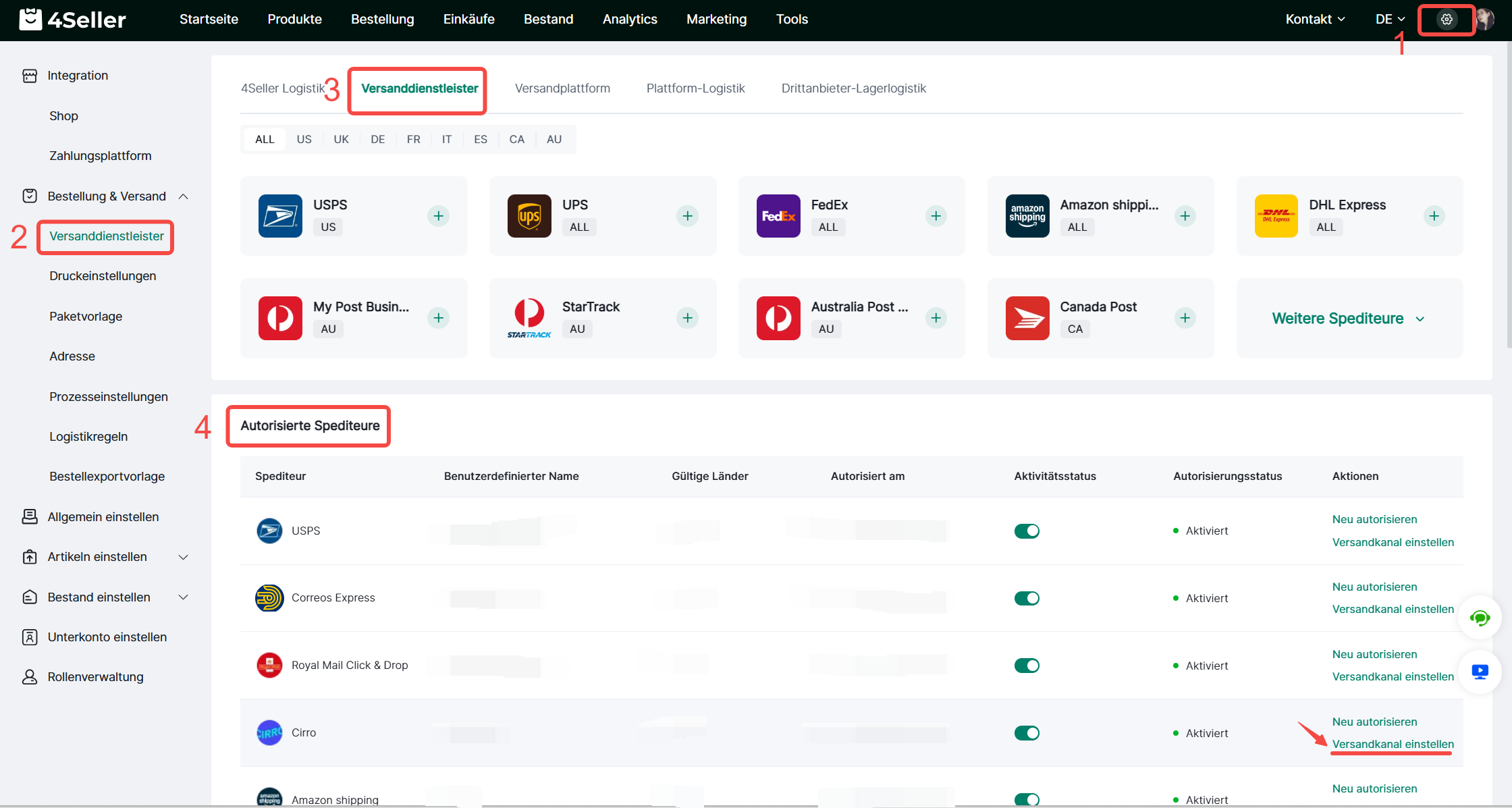 Tipp 1: Auf der Seite „Einstellungen >Bestellung&Versand > Versanddienstleister “ kannst du folgende Informationen zu Versandanbieters einsehen.