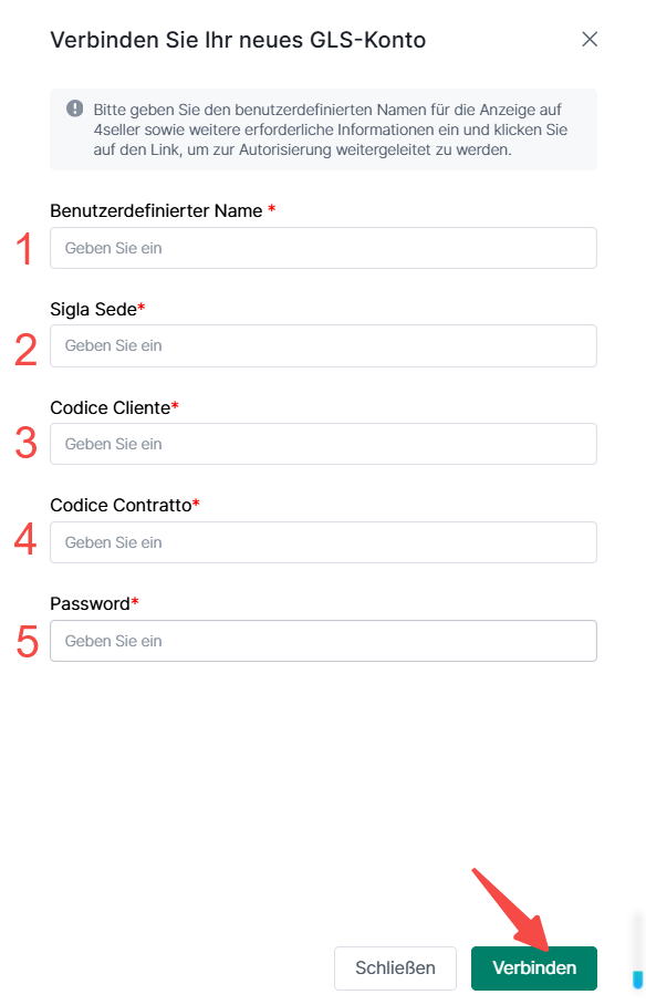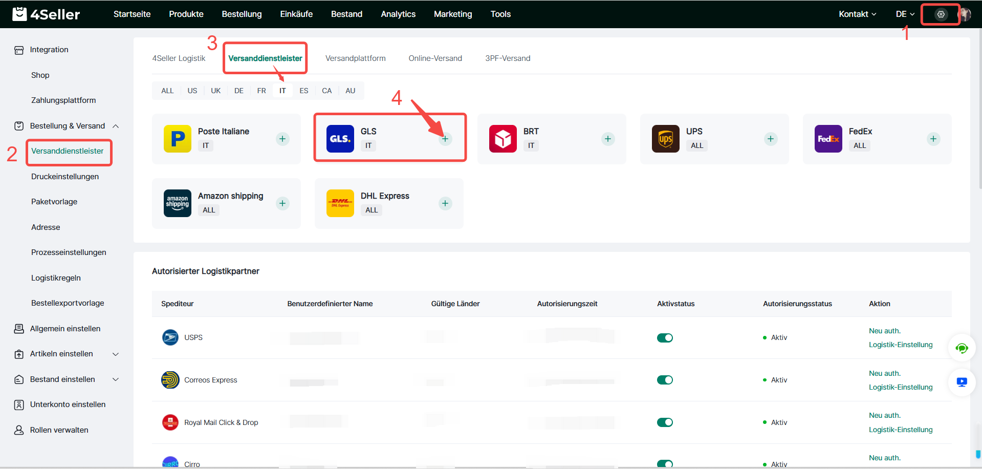 Klicke auf Einstellungen und suche Versanddienstleister in Bestellung&Versand. Klicke anschließend auf das GLS IT-Symbol, um ein neüs Konto hinzuzufügen.Schritt 2: Es öffnet sich ein neüs POP-UP. Gebe dort den Name, User, Passwort, Sender customer code Departure depot and Pricing ein. Bestätige Informationen und klicke auf Verbinden.