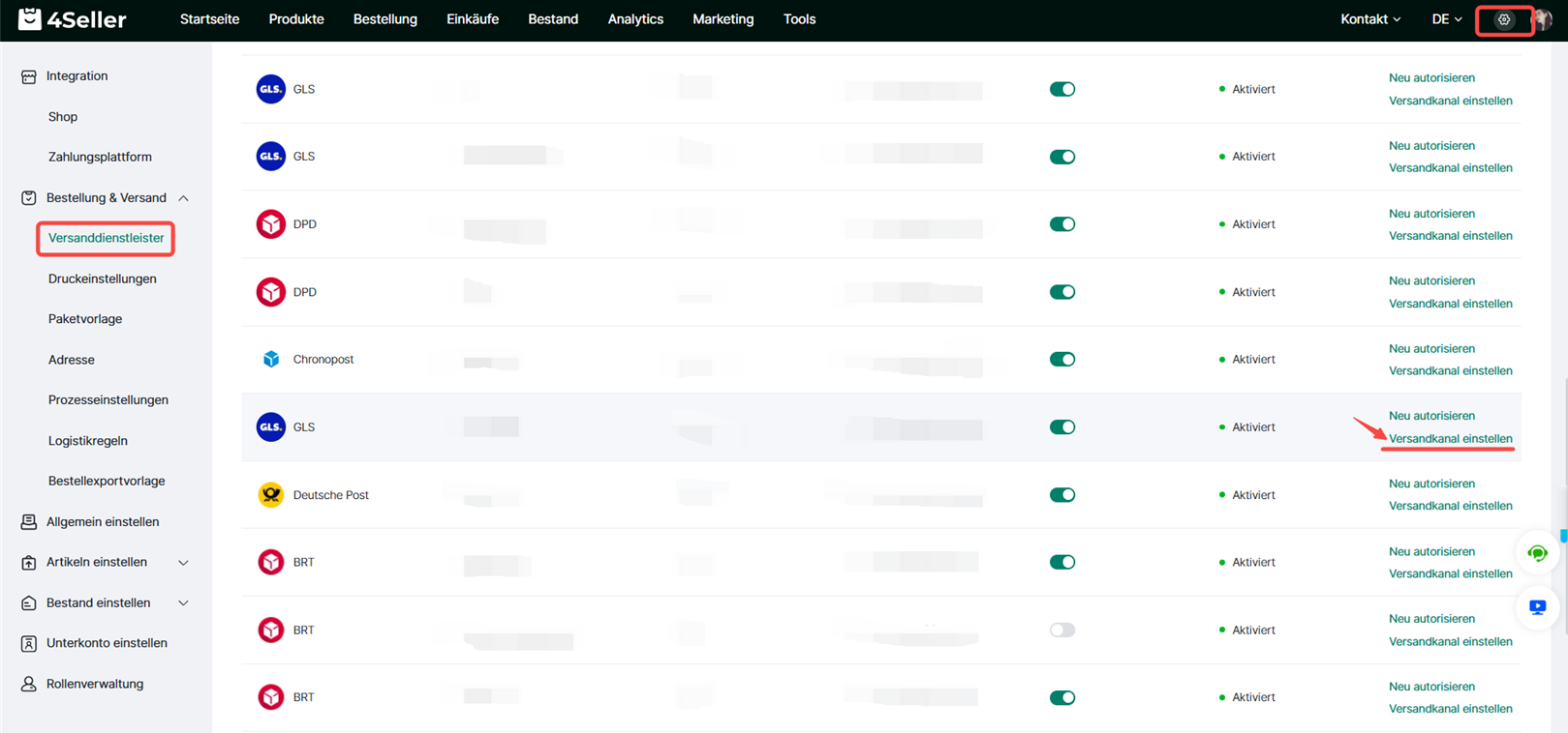 Tipp 1: Auf der Seite „Einstellungen >Bestellung&Versand > Versanddienstleister“ kannst du folgende Informationen zu Versandanbieters einsehen.