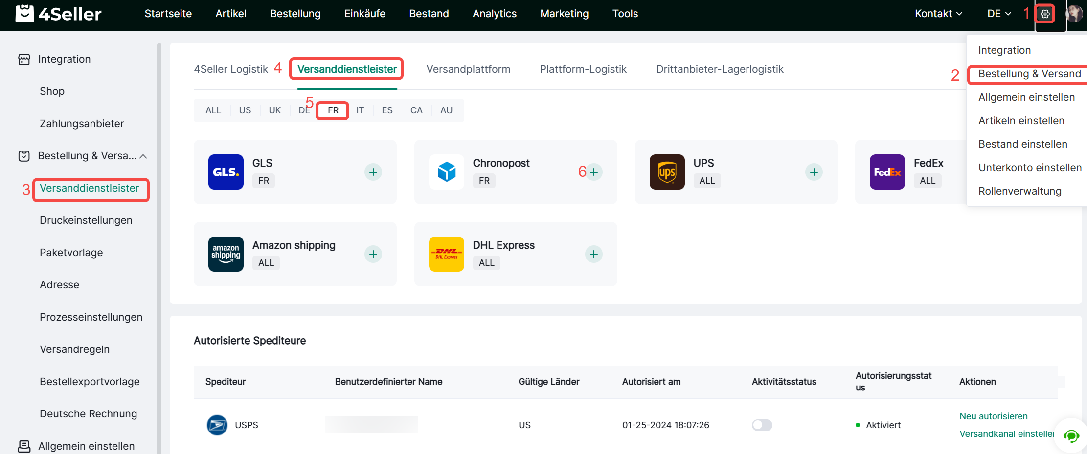 Auf der Seite „Einstellungen >Bestellung&Versand > Versanddienstleister“ kannst du folgende Informationen zu Versandanbieters einsehen.Kundensupport: Solltest du Probleme bei dieser Process haben, bitte kontaktiere uns unter: support@4seller.com
