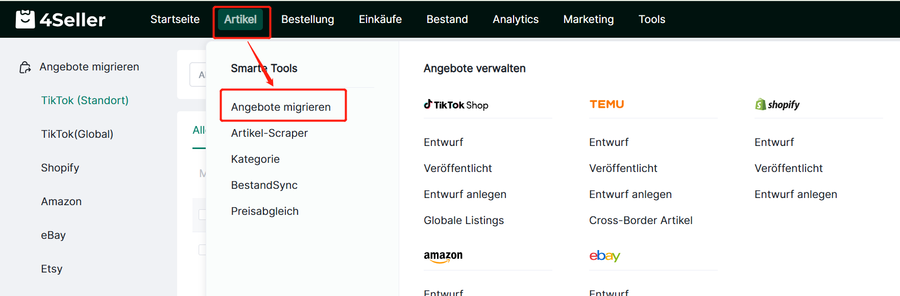 Einstieg 1: Artikel → Angebote migrieren → Wählen Sie aus, von welcher Plattform Sie migrieren möchten → Migrationsseite