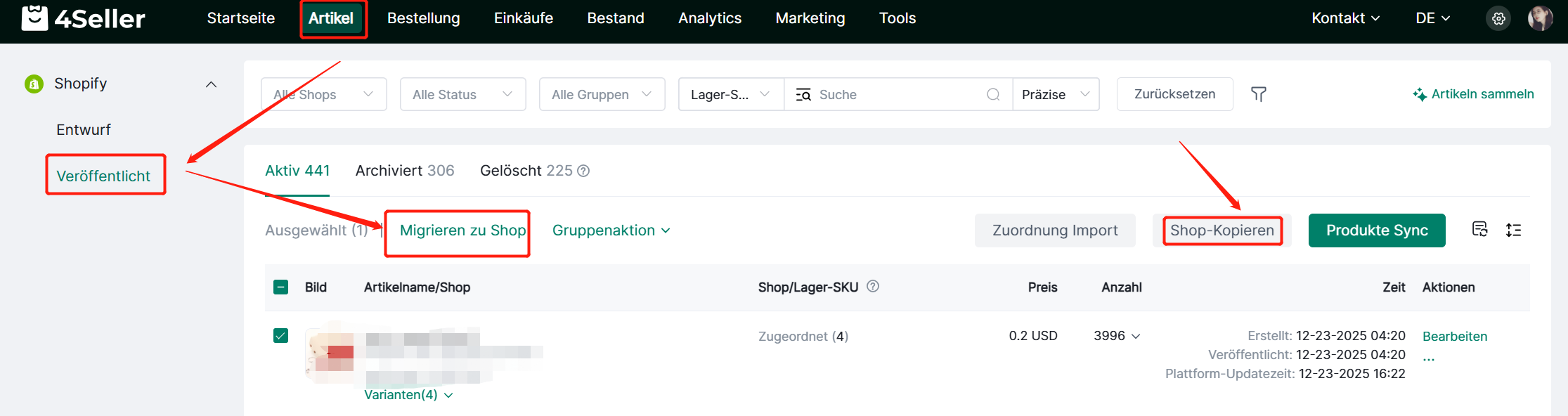 In 4Seller können Produkte mit dem Status „Veröffentlicht“ in Shopify-, Amazon-, TikTok-, Shein-, eBay-, Etsy- und WooCommerce-Stores über „In Stores kopieren“ oder „Nach Shop kopieren“ mit Amazon Stores synchronisiert werden.