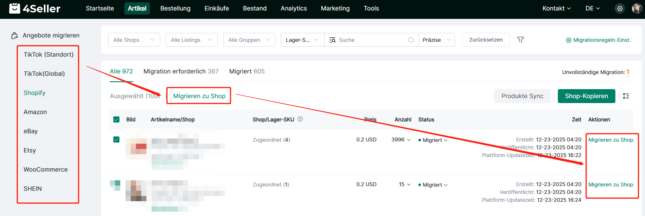 1. Wählen Sie einzelne oder mehrere Listings aus und klicken Sie auf „Migrieren zu Shop“.