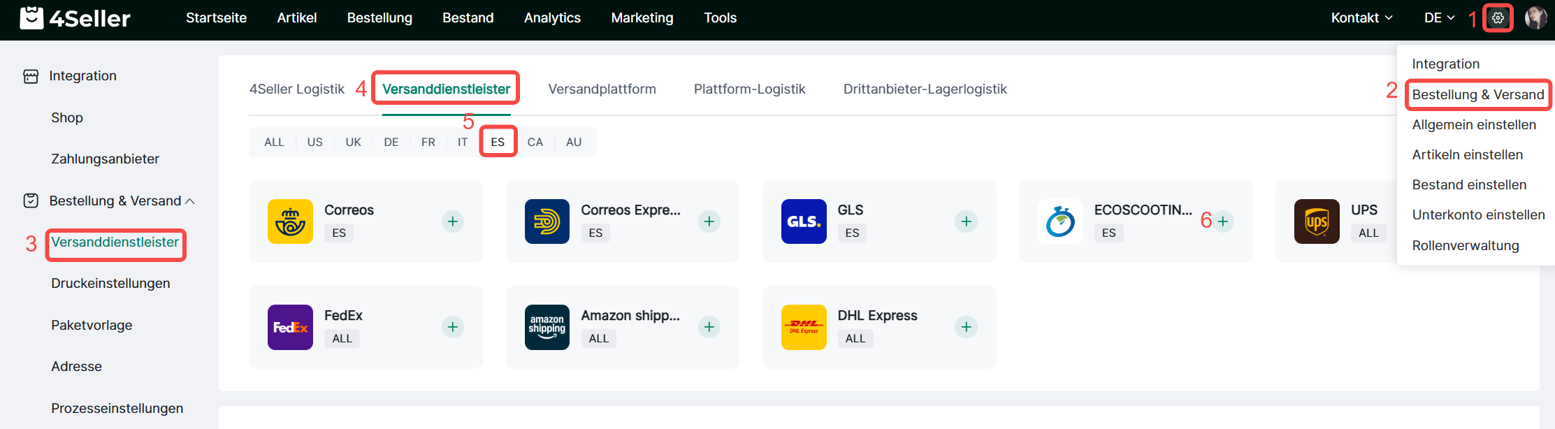 Tipp 1: Auf der Seite „Einstellungen >Bestellung&Versand > Versanddienstleister“ kannst du folgende Informationen zu Versandanbieters einsehen.
